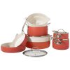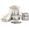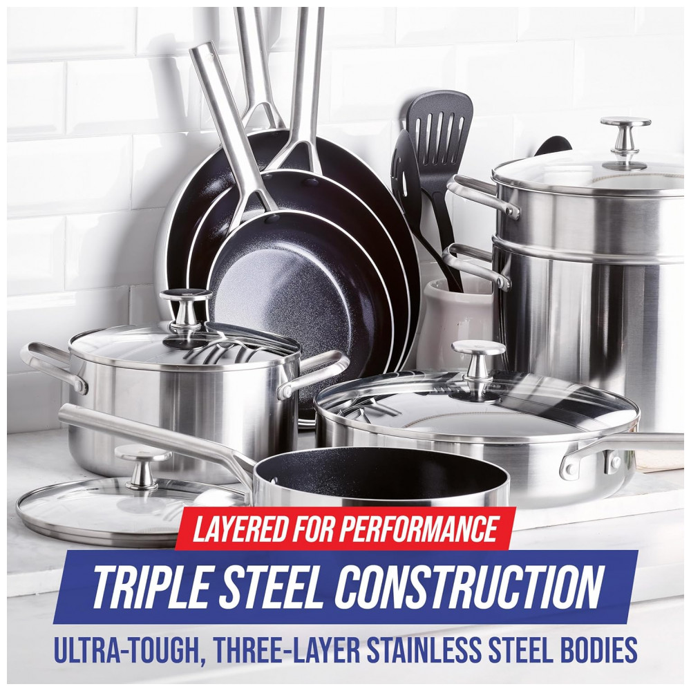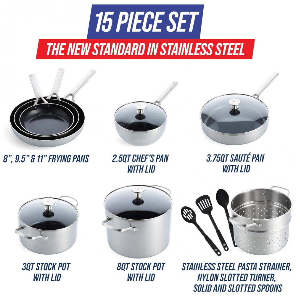 O conjunto de utensílios de cozinha inclui frigideiras de , e Panela do Chef 2,5 litros com tampa frigideira de 3,75 litros com tampa Caldeirões 3 litros e 8 litros com tampa coador de macarrão em aço inox espátula de náilon, colheres sólidas e ranhuradas.