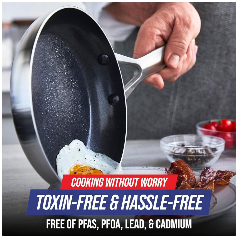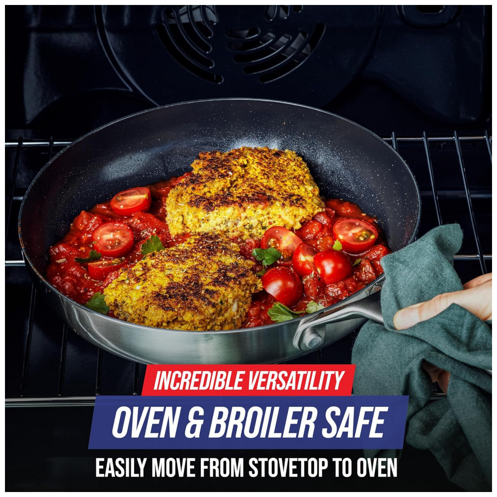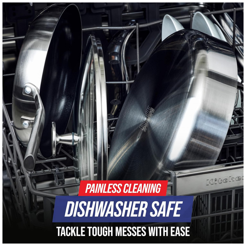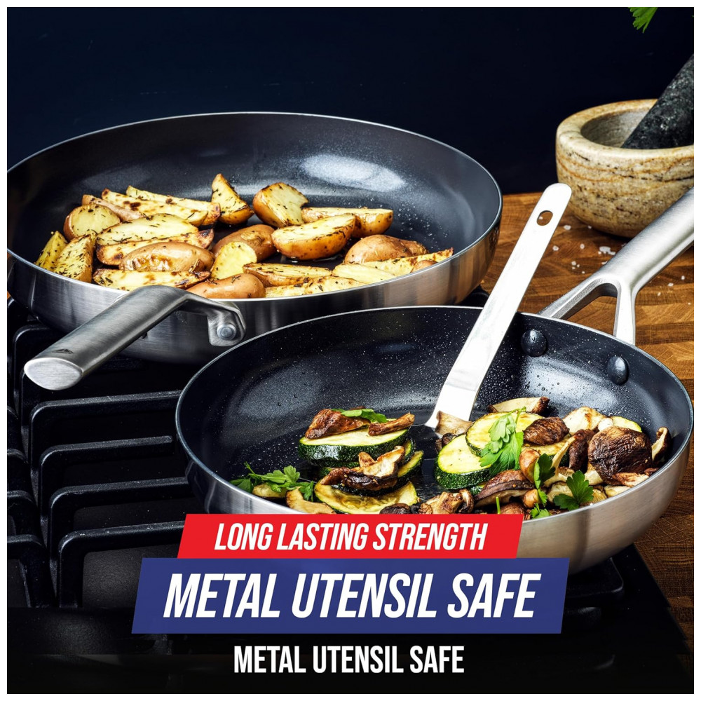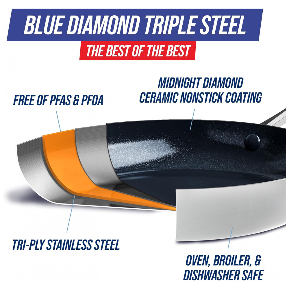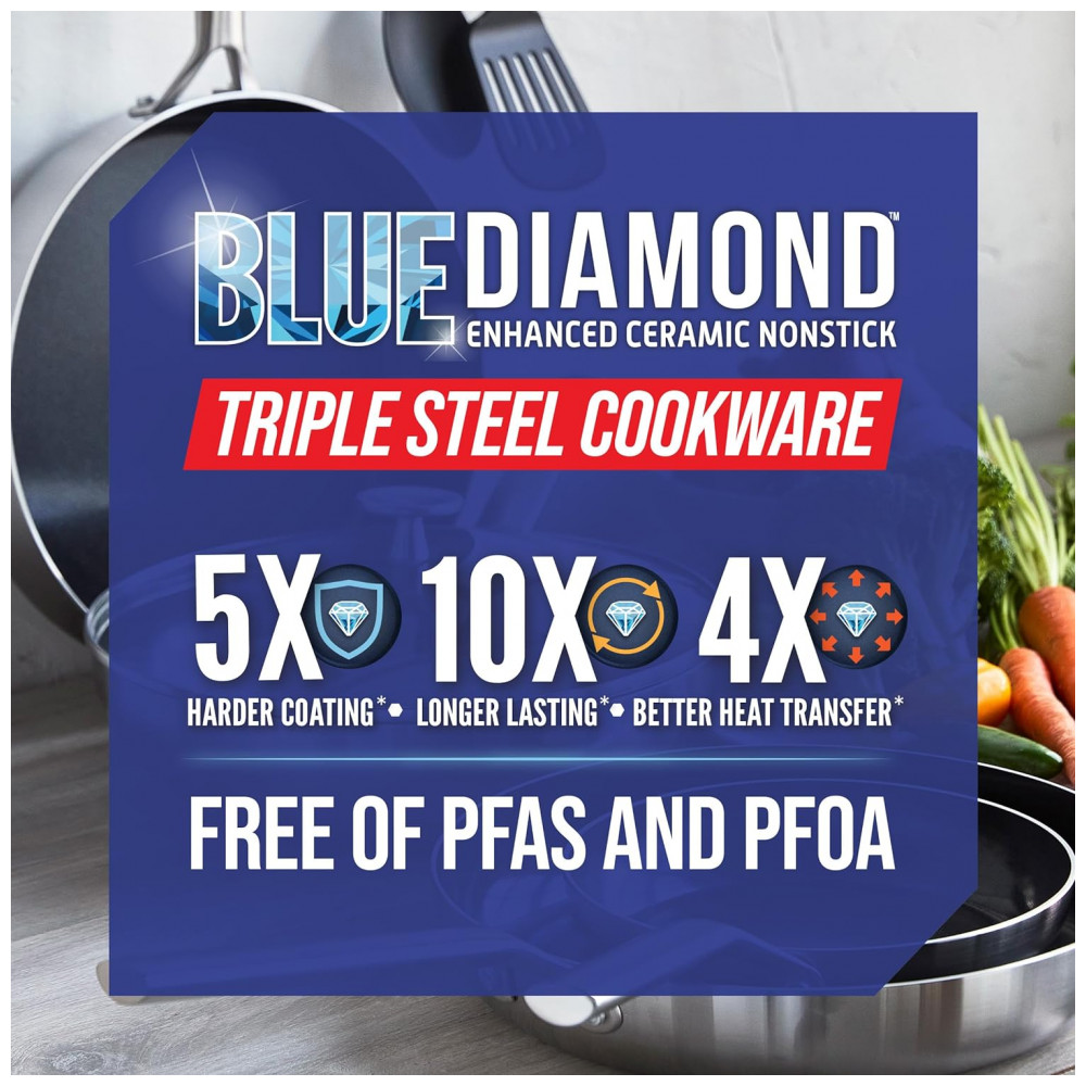 para utensílios de metal, o revestimento com infusão de diamante do Blue Diamond é 5 vezes mais duro e 10 vezes mais duradouro do que o antiaderente tradicional.