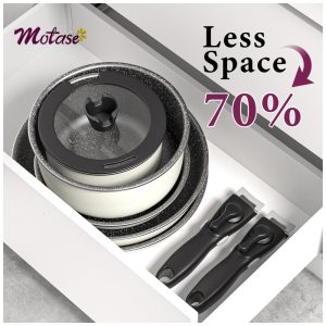 Para um armário organizado: Com o conjunto de panelas e frigideiras Motase, você pode otimizar seu espaço. As alças removíveis permitem empilhar facilmente os utensílios, economizando até 70% de espaço no armário, deixando sua cozinha mais arrumada e funcional.