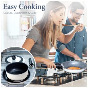 Conjunto de utensílios de cozinha multitarefas: As alças removíveis oferecem máxima versatilidade. Com um único clique, você pode usar as panelas em todos os tipos de fogões, no forno, na grelha, até mesmo na geladeira e na mesa, sem precisar de diferentes utensílios para cada função.