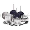 O QUE ESTÁ NA CAIXA Duas frigideiras, duas panelas com tampas 1,5L e 3L, uma panela diária de 6L com tampa e inserção de vaporizador de cerâmica, um forno holandês de 6L com tampa e inserção de vaporizador de cerâmica e doze sacos de cuidados de proteção