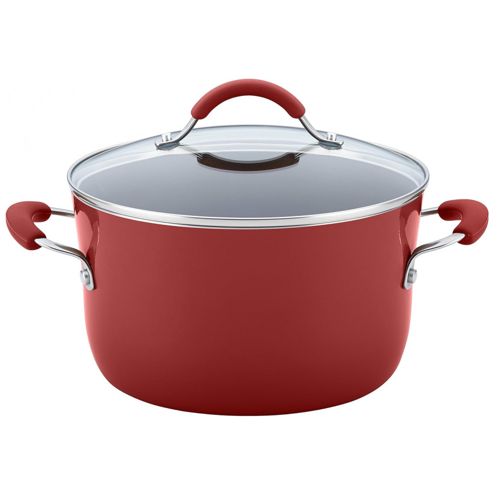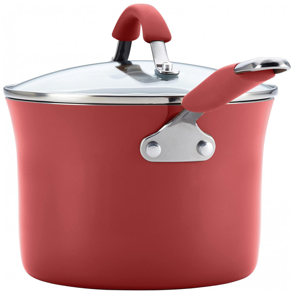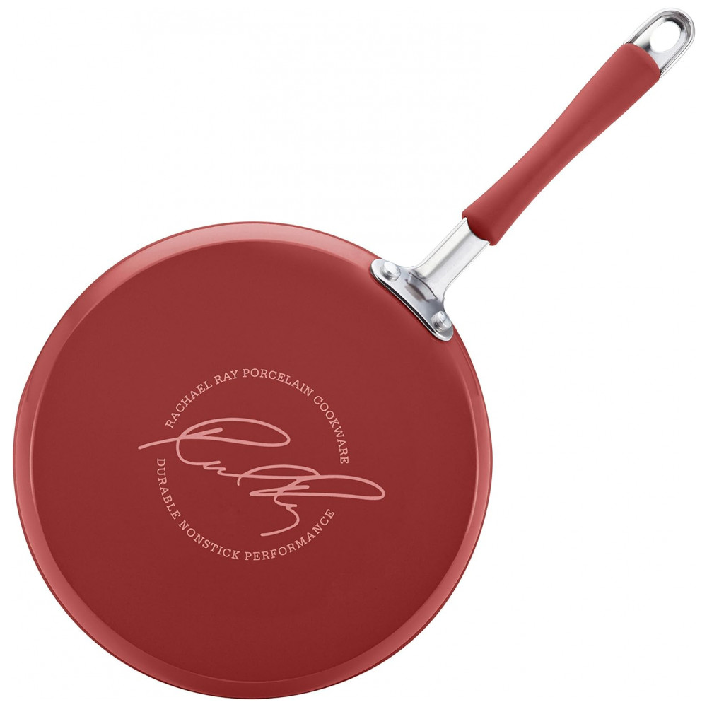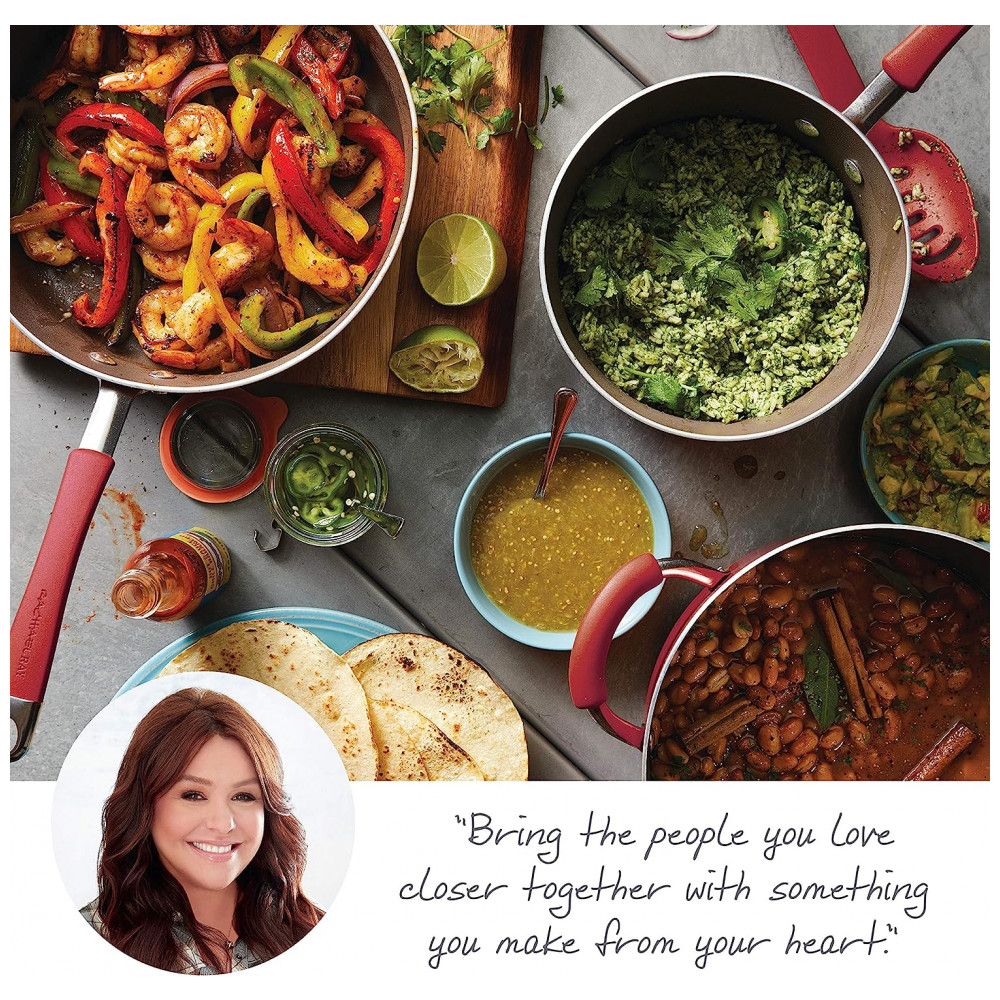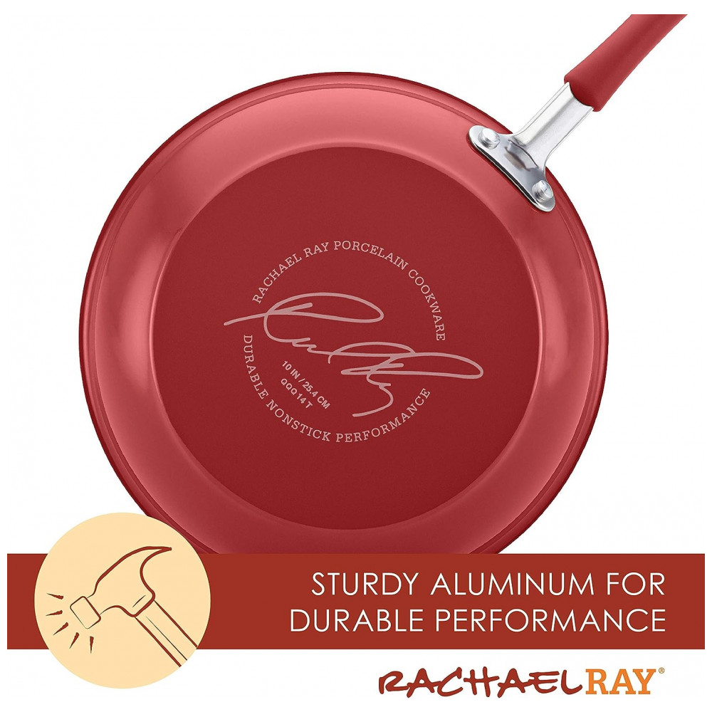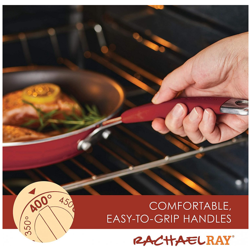 DESIGN DURÁVEL Panelas e frigideiras antiaderentes de Rachael Ray são feitas com alumínio durável e exteriores de porcelana de esmalte duro resistente para resistir a cozinhas ocupadas.