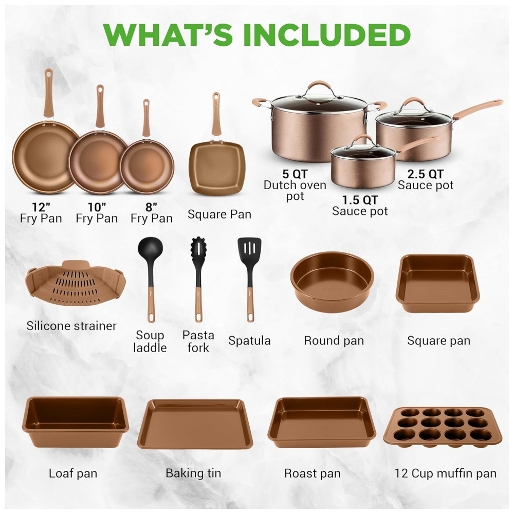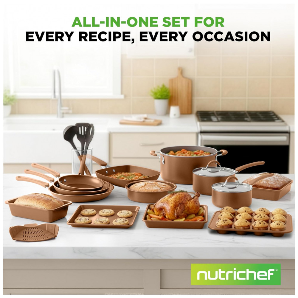 CONJUNTO DE 20 PEÇAS O conjunto de panelas antiaderentes NutriChef de 20 peças inclui 6 conjunto de assadeiras, 3 utensílios de nylon, escorredor de silicone, frigideiras abertas, pote de molho de 1,5L e 2,5L com tampa, 5L ensopado panela com tampa, grelha, concha de sopa, garfo para macarrão e espátula.