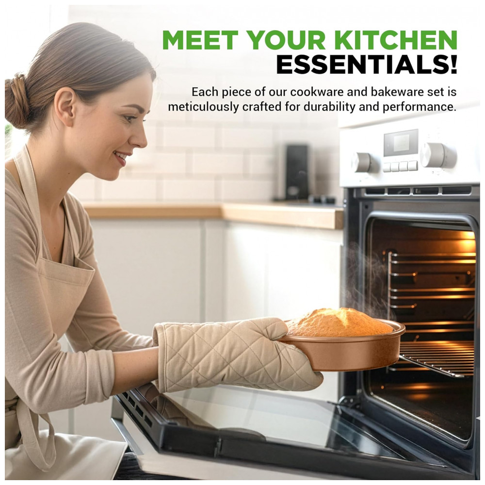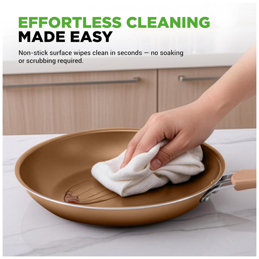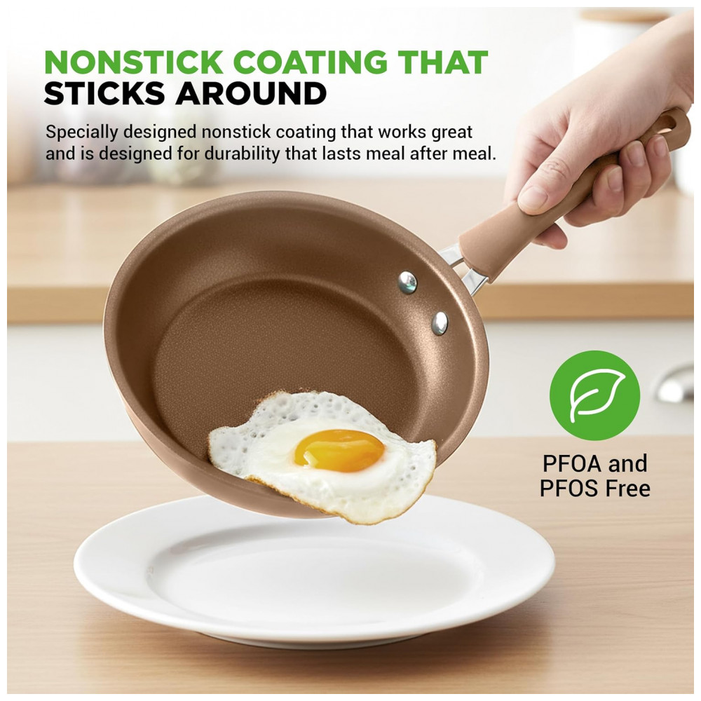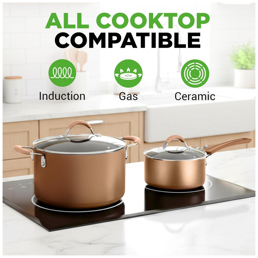 PRONTO PARA INDUÇÃO As panelas e frigideiras são seguras para uso em fogões a gás, elétricos, cerâmicos e de indução. Feito de alumínio prensado reforçado com 18 25um, espessura de revestimento multicamadas de 2,. Inclui utensílios de silicone de nylon sem arranhões