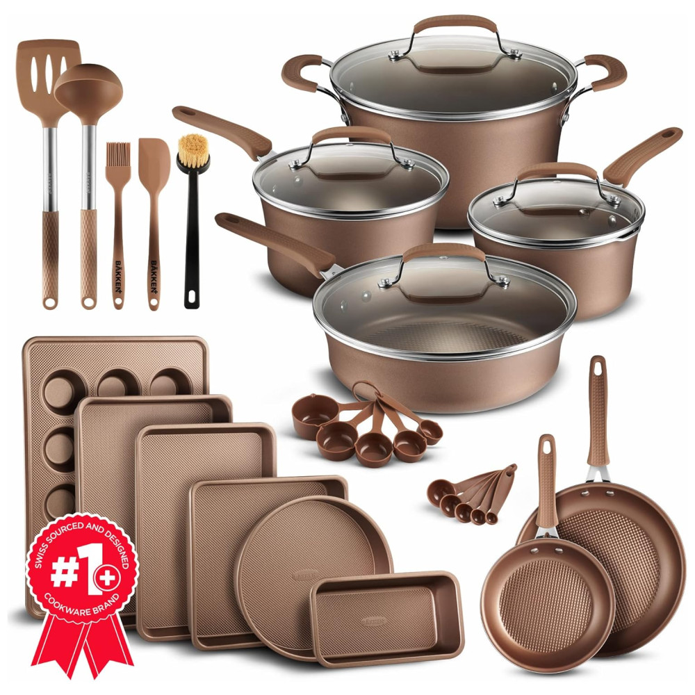 Conjunto de Panelas e Frigideiras Antiaderentes em Alumínio com Utensílios 23 Peças BAKKEN Swiss Bronze