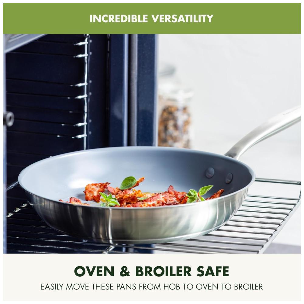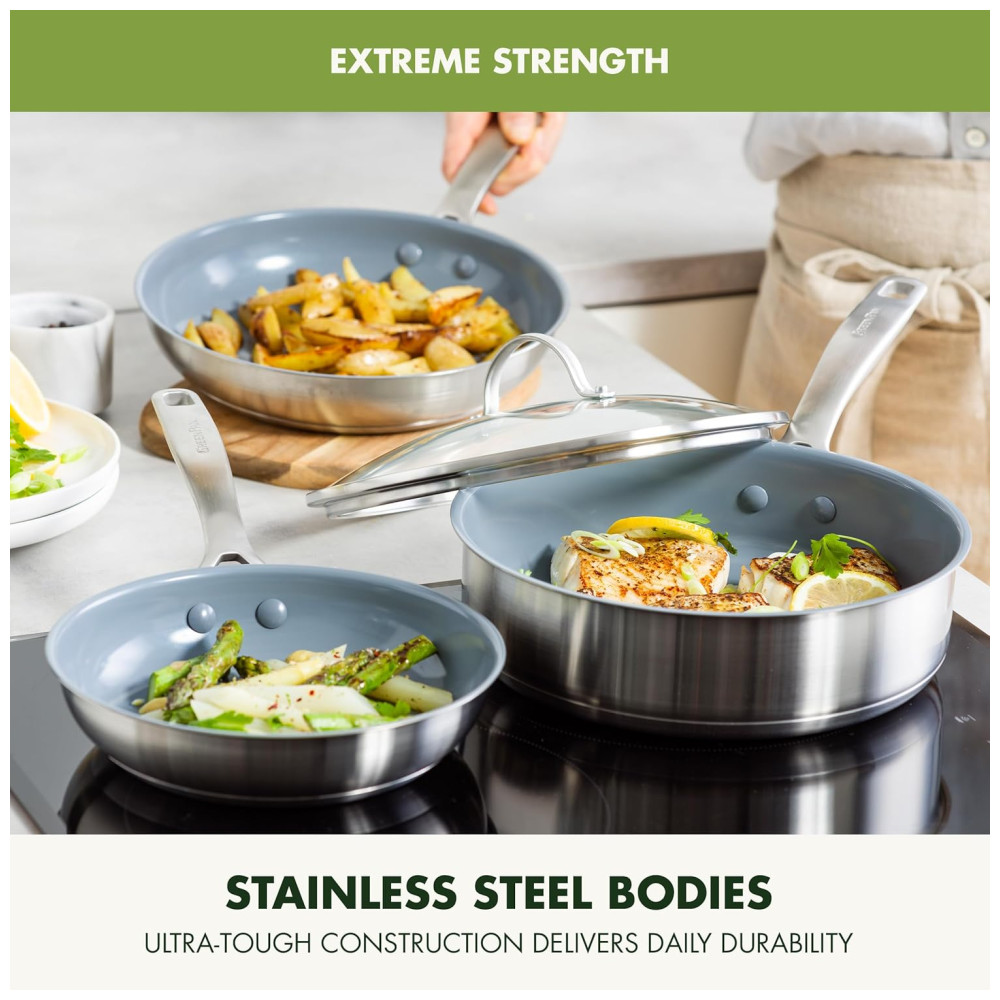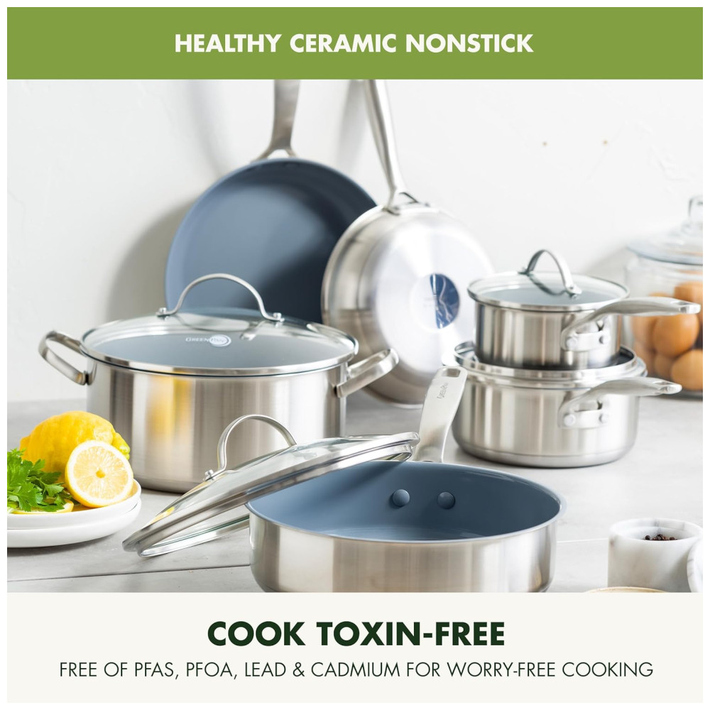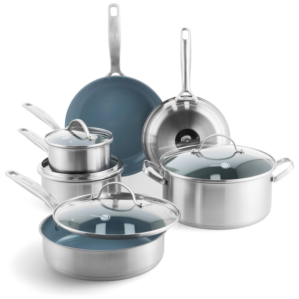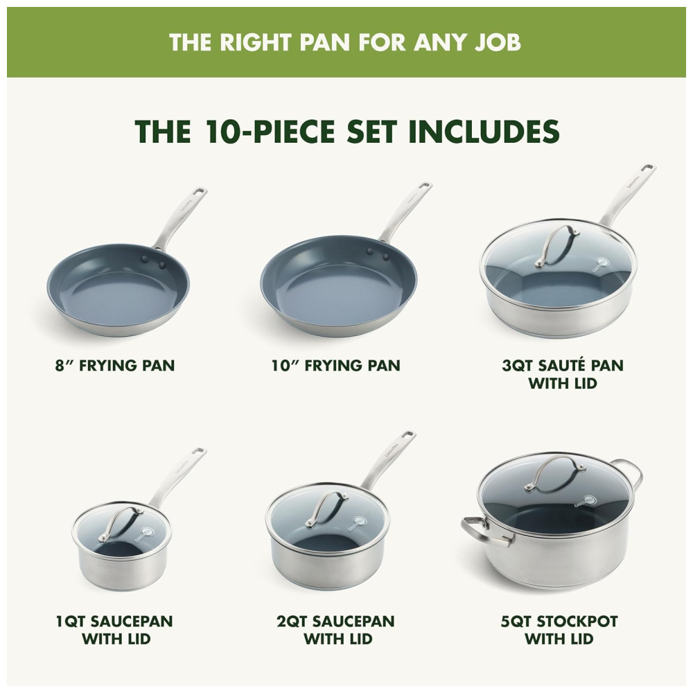 Conjunto de Panelas e Frigideiras de Aço Inoxidável 10 Peças com Revestimento Antiaderente Cerâmico Livre de Produtos Químicos GreenPan Prata