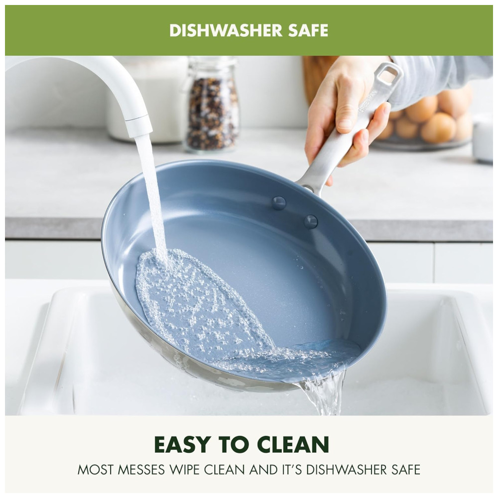Este conjunto inclui 8 e 10 frigideiras, caçarolas de 0,93 litros e 1,87 litros com tampa, frigideira de 2,80 litros com tampa, caldeirão de 4,66 litros com tampa e esponja Renew. Seguro para utensílios de metal, o revestimento antiaderente original da GreenPans com infusão de diamante oferece durabilidade notável, aquecimento equilibrado e limpeza sem esforço. O revestimento antiaderente de cerâmica saudável GreenPans Thermolon TOXINFREE é livre de PFAS, PFOA, chumbo e cádmio para refeições sem preocupações. A construção ultrarresistente e a base encapsulada proporcionam excelente transferência de calor e durabilidade duradoura.