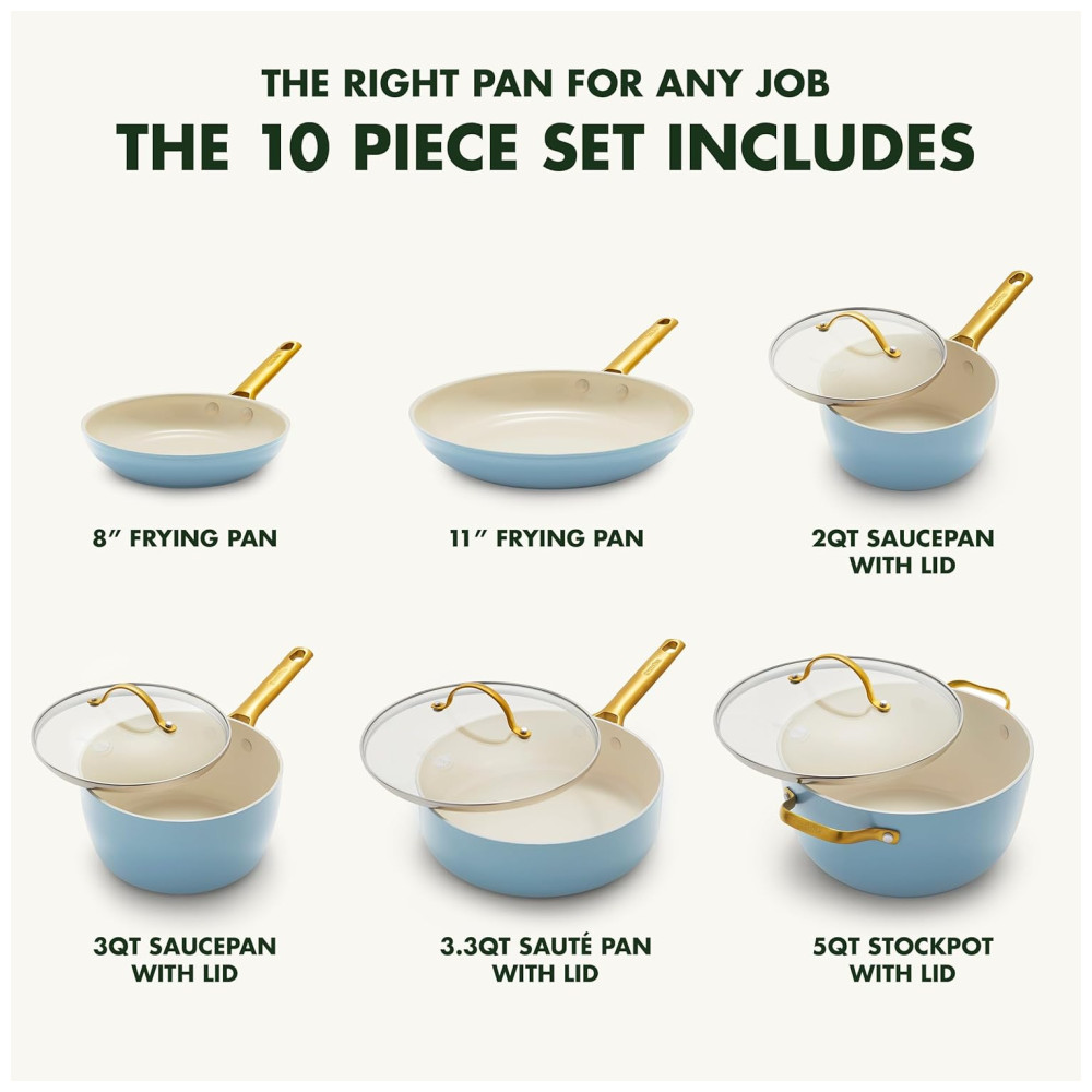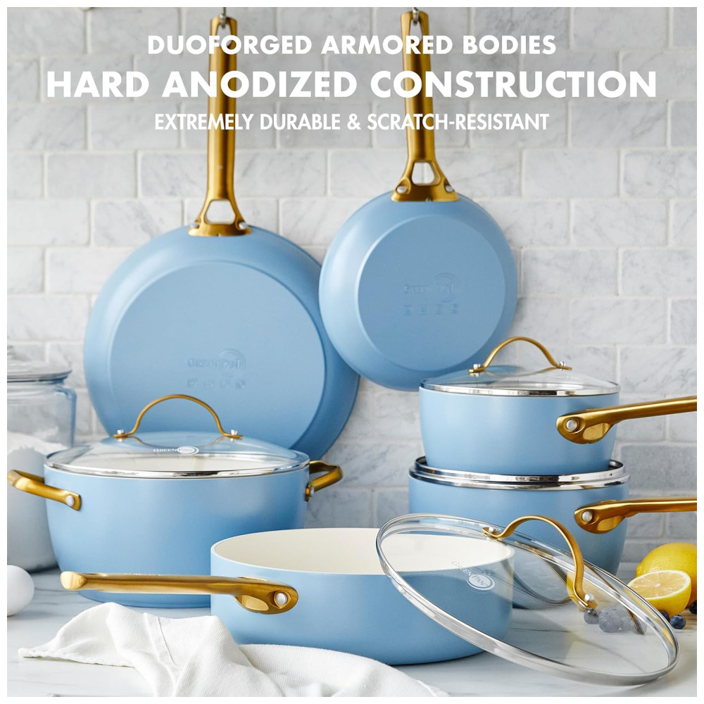 Conjunto de Panelas e Frigideiras de Cerâmicas Anodizadas Antiaderentes 10 Peças com Alça GreenPan Azul Celeste