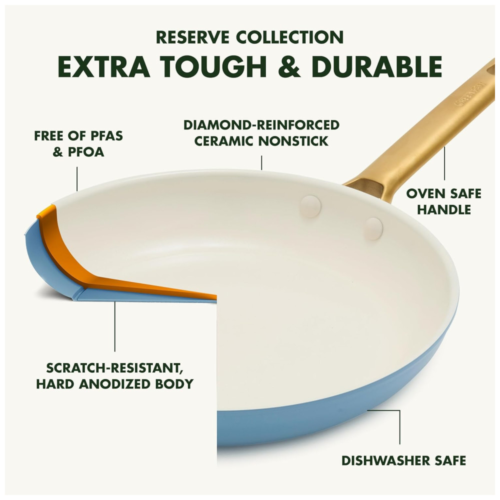 A coleção GreenPan Reserve apresenta uma tecnologia de classe mundial combinada com um estilo minimalista. Cada panela é construída em alumínio anodizado rígido duoforjado, o que a torna resistente a arranhões e promove uma distribuição uniforme de calor para um cozimento consistente.