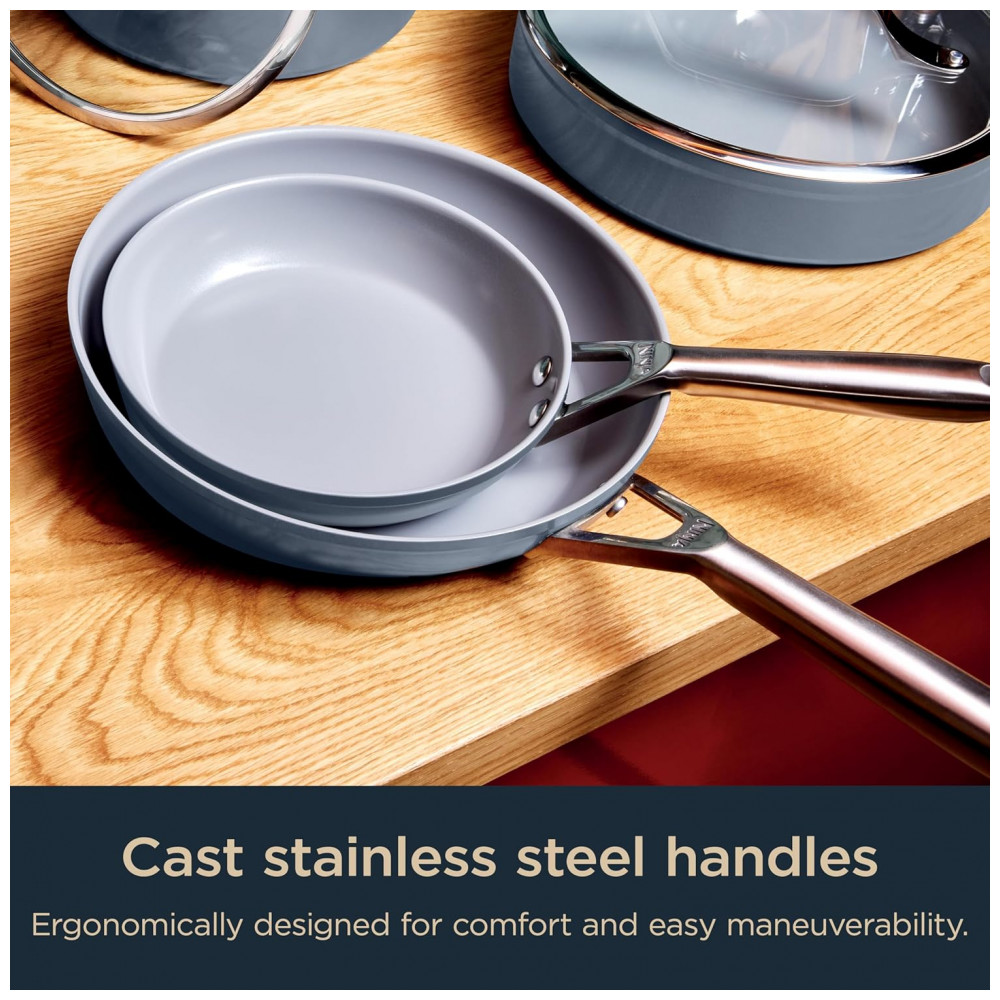 O conjunto de panelas Ninja NeverStick Ceramic Pro 10 peças foi desenvolvido para uso intenso em cozinhas residenciais, combinando corpo em alumínio de alto calibre com revestimento cerâmico antiaderente livre de PTFE, PFOA, chumbo e cádmio. A tecnologia NeverStick utiliza primer profundamente incorporado à superfície de cozimento, formando uma camada mais resistente a riscos, abrasão e perda de desempenho antiaderente ao longo do tempo.