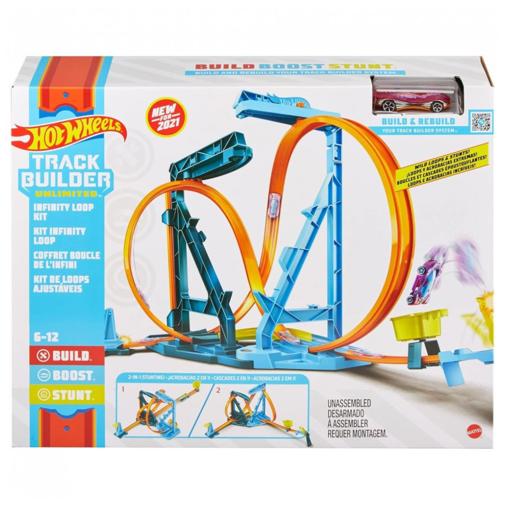 O kit Hot Wheels Track Builder Unlimited Infinity Loop transforma um loop padrão em duas configurações emocionantes e desafiadoras que convidam as crianças a experimentar o impulso de maneiras visualmente emocionantes! O lançador de suporte envia os carros em alta velocidade para o loop infinito e depois para uma pista de saída com um salto que lança os veículos para o coletor de captura