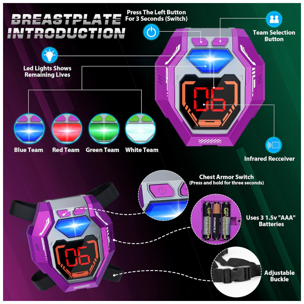 Fácil de Configurar: Para começar a diversão, basta abrir o compartimento da bateria e inserir as pilhas nas posições corretas. As pistolas funcionam com 4 pilhas AAA, e os coletes com 3 pilhas AAA (pilhas não inclusas). Monte sua equipe, troque de modo e prepare-se para um jogo emocionante de combate, seja dentro de casa, no quintal ou em qualquer área externa.