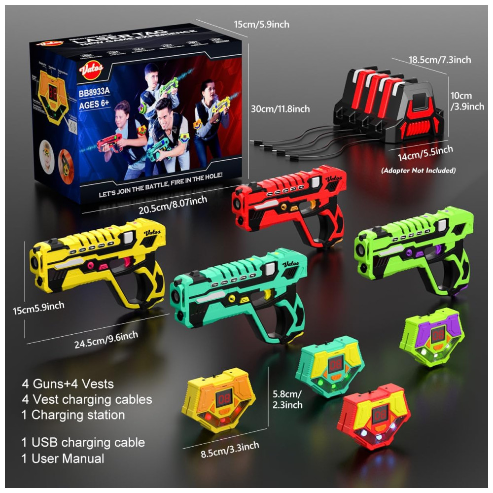 Laser Tag Recarregável Atualizado: Diga adeus ao incômodo das trocas frequentes de baterias! Este conjunto de 4 armas de laser tag vem com uma estação de carregamento inovadora, permitindo recarregar todos os equipamentos de uma vez só. Cada carga oferece aproximadamente 8 jogos, proporcionando longas horas de diversão. (Atenção: o adaptador DC 5V-2A/3A não está incluso). Reúna seus amigos e familiares e entre nessa batalha emocionante!
