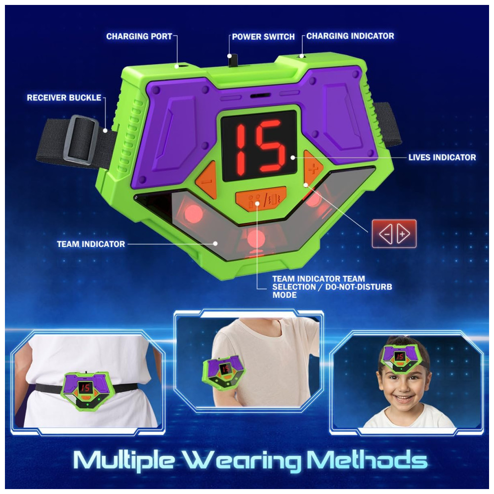 Sincronização Inteligente de Dados 2.4GHz: O sistema de sincronização inteligente de 2.4GHz garante que todos os dados dos jogadores sejam exibidos de forma precisa e ao vivo. Ao emparelhar as armas com os receptores, você pode ver o status das vidas e da arma em tempo real na tela LCD. A contagem de vidas é atualizada automaticamente durante o jogo, permitindo que você acompanhe seu progresso e ajuste sua estratégia. Também é possível definir diferentes valores de vida (de 1 a 99), permitindo que você escolha a dificuldade ideal para o jogo, seja para iniciantes ou jogadores experientes.