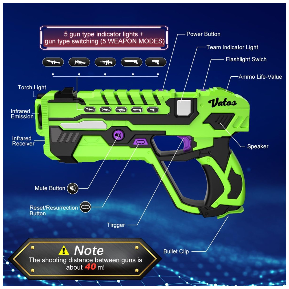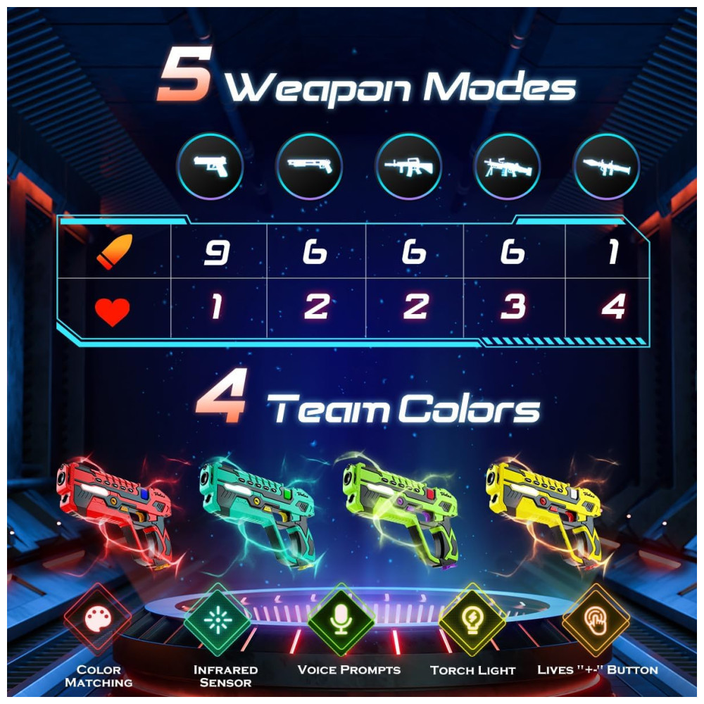 4 Equipes e 5 Modos de Arma: Divirta-se em batalhas épicas de laser tag com até 4 jogadores, mas jogadores adicionais podem participar comprando conjuntos extras. Você pode alternar entre 5 modos de arma diferentes: foguete, metralhadora, submetralhadora, espingarda e pistola, adicionando mais estratégia e emoção ao jogo. O alcance de tiro de 40 metros (131 pés) funciona perfeitamente em ambientes internos ou externos. Coloque o receptor, pegue sua arma e prepare-se para a batalha!