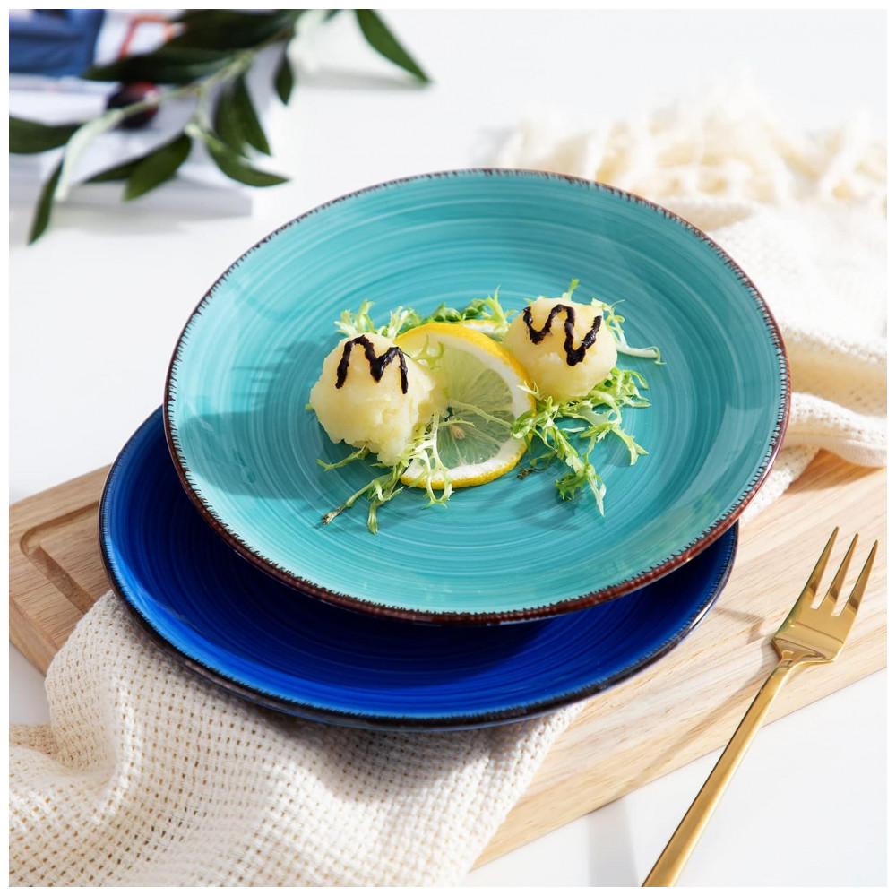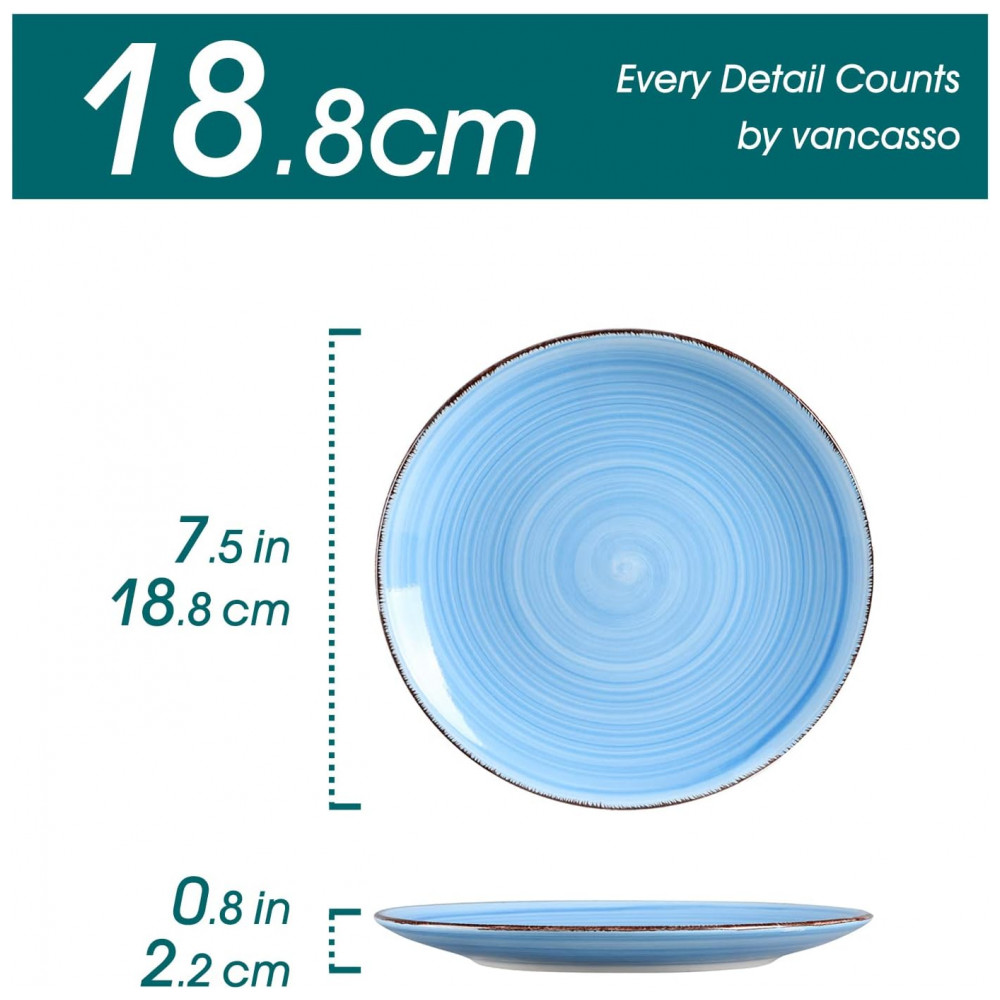 Chic Design Os 6 azuis diferentes foram vidrados nos dois lados das placas, harmoniosos e bonitos. Os pratos de salada são coloridos por pigmentos inorgânicos a altas temperaturas, sem desbotamento e são duradouros. O design moderno de redemoinho como um pirulito dá às pessoas um infinitamente doce. A borda do prato é delineada com linhas de cílios marrons, tornando os pratos de sobremesa mais artísticos e únicos.