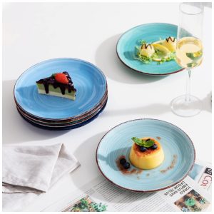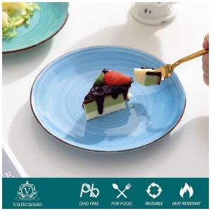Chic Design Os 6 azuis diferentes foram vidrados nos dois lados das placas, harmoniosos e bonitos. Os pratos de salada são coloridos por pigmentos inorgânicos a altas temperaturas, sem desbotamento e são duradouros. O design moderno de redemoinho como um pirulito dá às pessoas um infinitamente doce. A borda do prato é delineada com linhas de cílios marrons, tornando os pratos de sobremesa mais artísticos e únicos.
