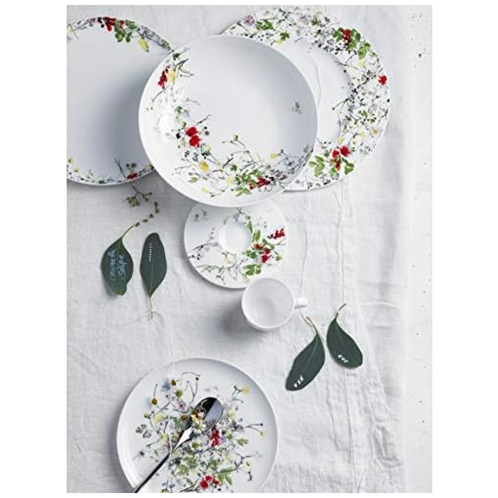 Esta louça Rosenthal, conhecida como Brillance Fleurs Sauvages, é feita de porcelana óssea de alta qualidade, conferindo um estilo elegante e formal. Com predominância do branco, ela apresenta decorações florais vibrantes que a tornam um item chamativo e sofisticado para qualquer mesa ou bancada.