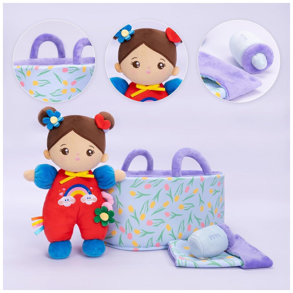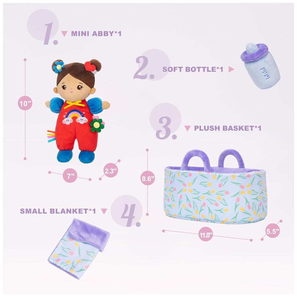 Macio e Seguro: As bonecas de bebê macias são feitas de tecidos de alta qualidade de grau A, super macios, seguros, não tóxicos, amigáveis à pele sensível e laváveis à máquina. Design Original: Após 100 famílias estudarem e discutirem, nossos brinquedos de pelúcia macios patenteados são especialmente projetados por nossos 8 designers especializados para crianças. Amigos para Sempre: Através de jogos de faz de conta, estas bonecas de pelúcia macias proporcionam às crianças uma sensação de conforto e segurança, desenvolvendo sua autoconfiança e responsabilidade. Fácil de Transportar: Esta boneca de bebê de pelúcia para meninas e meninos tem aproximadamente 25,9 cm de tamanho e pesa apenas cerca de 0,5 kg. É ideal para as crianças brincarem ou abraçarem para dormir, proporcionando-lhes uma maior sensação de segurança. Presente Ideal: Nosso conjunto de presente de boneca macia é o presente ideal para quase todas as ocasiões – aniversários, chás de bebê, Natal, etc. Também é uma boneca encantadora e decorativa em qualquer prateleira ou quarto. Inclui uma boneca de bebê de pelúcia, uma cesta de pelúcia e uma pequena manta.