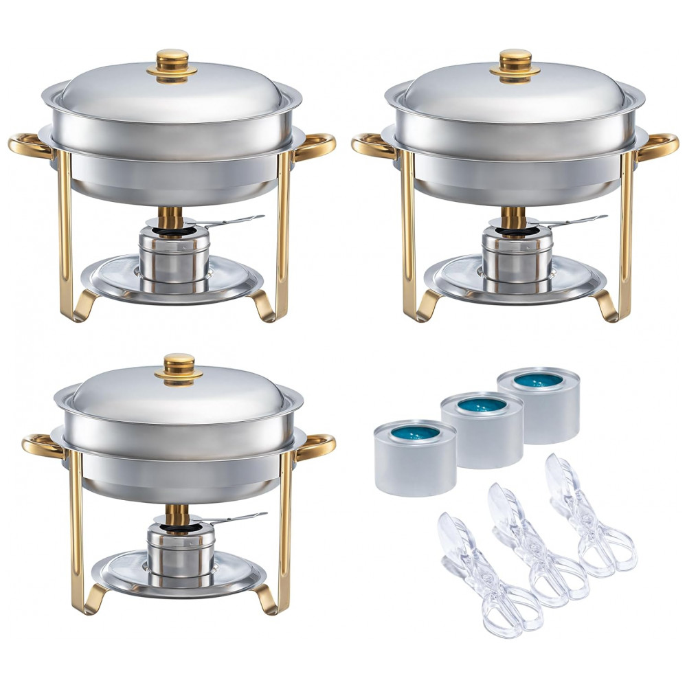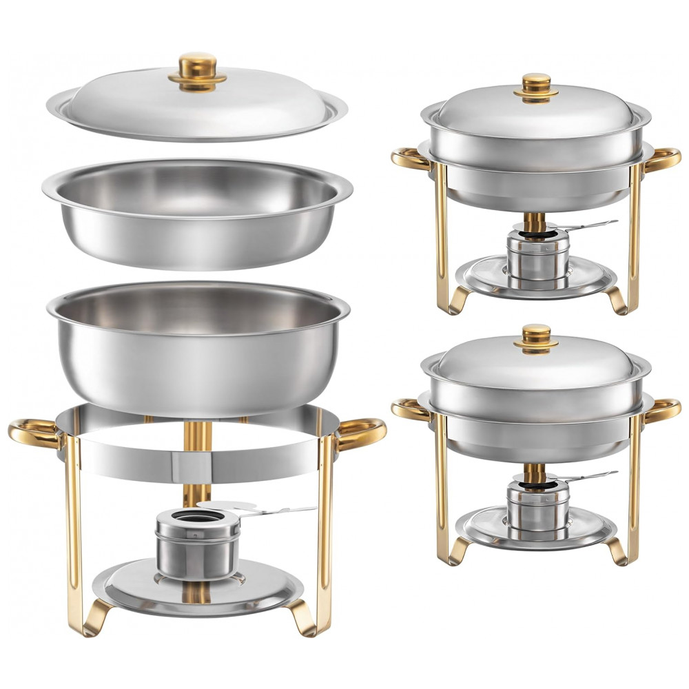 O conjunto inclui 3 bandejas de água redondas de 4 litros, 3 bandejas de alimentos, 3 tampas com alças com detalhes em ouro frio ao toque, 2 racks de chafer, 3 suportes de combustível, 3 placas de combustível