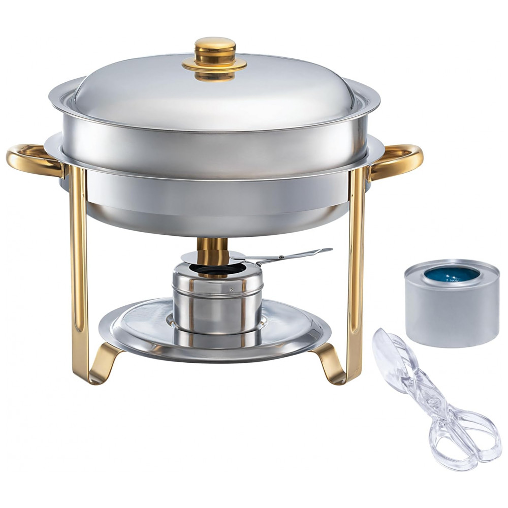 Este prato de chaf é um buffet de cafer de 4 litros e tamanho médio, perfeito para guardar aperitivos ou porções de comida para uma pequena festa ou refeição em família. Este aquecedor de alimentos tem detalhes em ouro elegantes nas alças. Este kit de buffet esterno serve como bandejas de buffet versáteis.