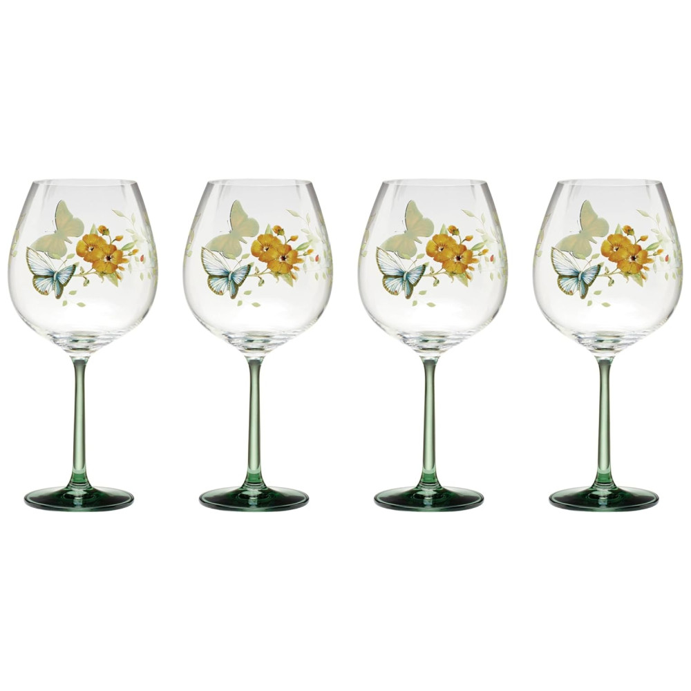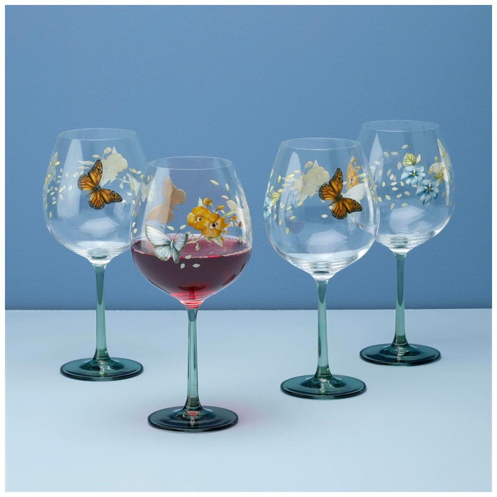 As taças de vinho de balão Butterfly Meadow apresentam um design exclusivo e encantador, com borboletas e abelhas animadas sobre uma folhagem vibrante. As flores elegantes completam o visual, transformando qualquer evento em uma verdadeira festa no jardim.