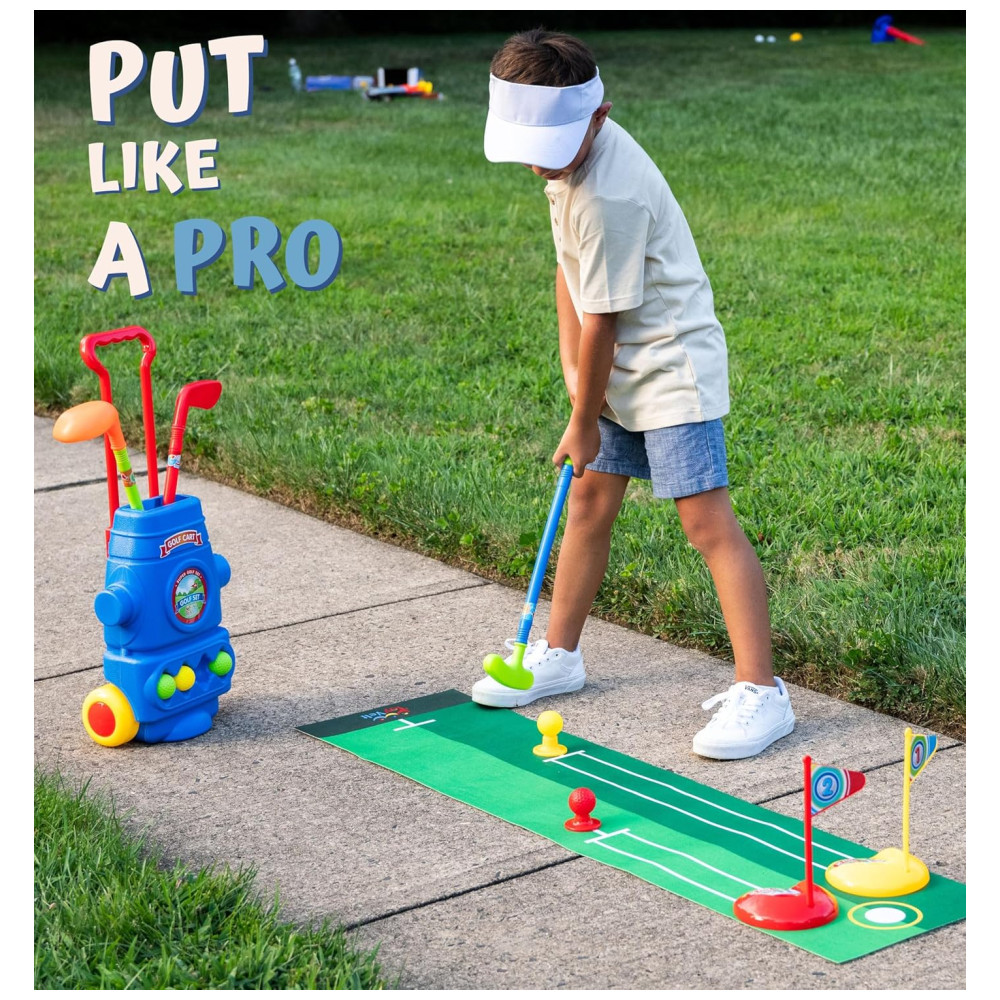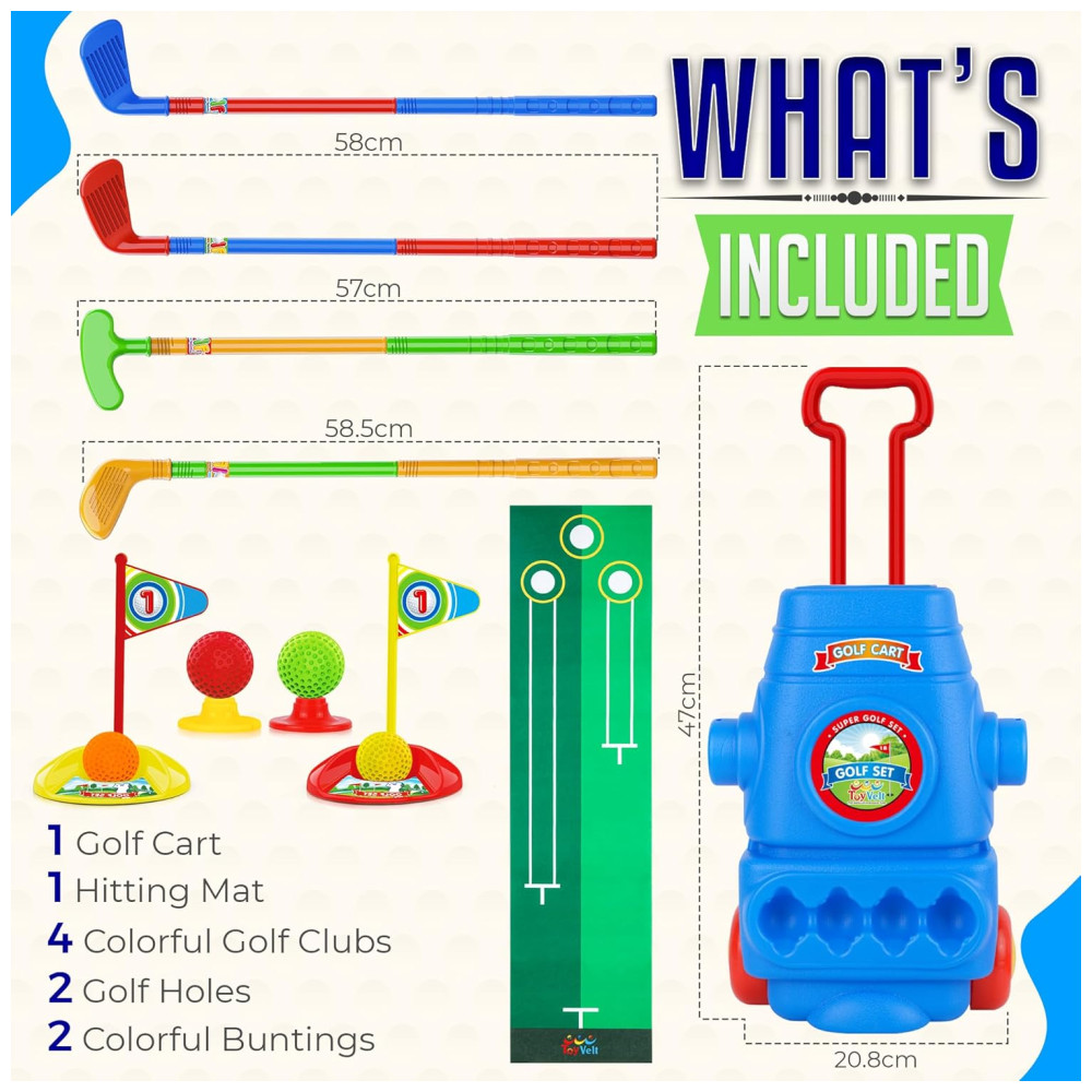 CONJUNTO DE GOLFE INICIANTE COMPLETO O ToyVelt Mini Golf Set inclui um prático carrinho de golfe com 2 rodas, 4 tacos de golfe coloridos de diferentes formas e tamanhos, 6 bolas especiais, um tapete de putting e 2 buracos de treino.