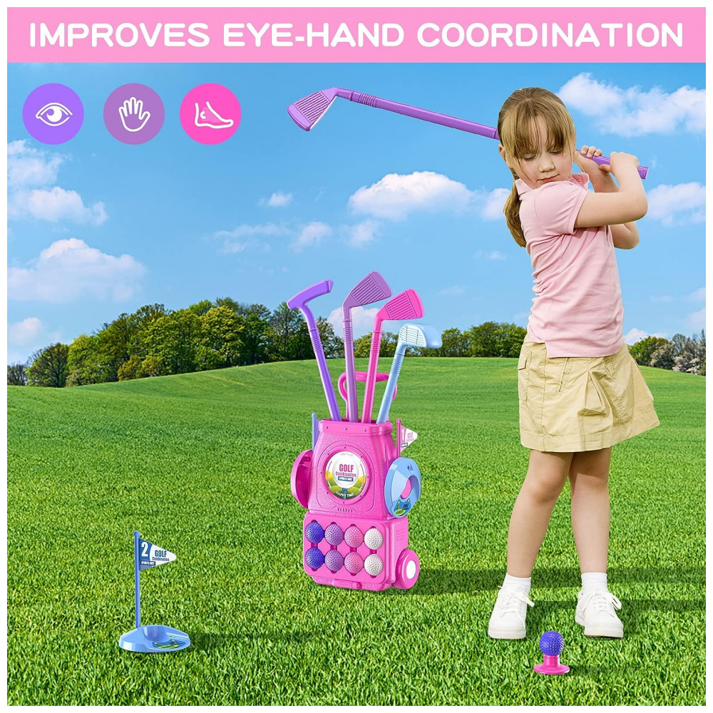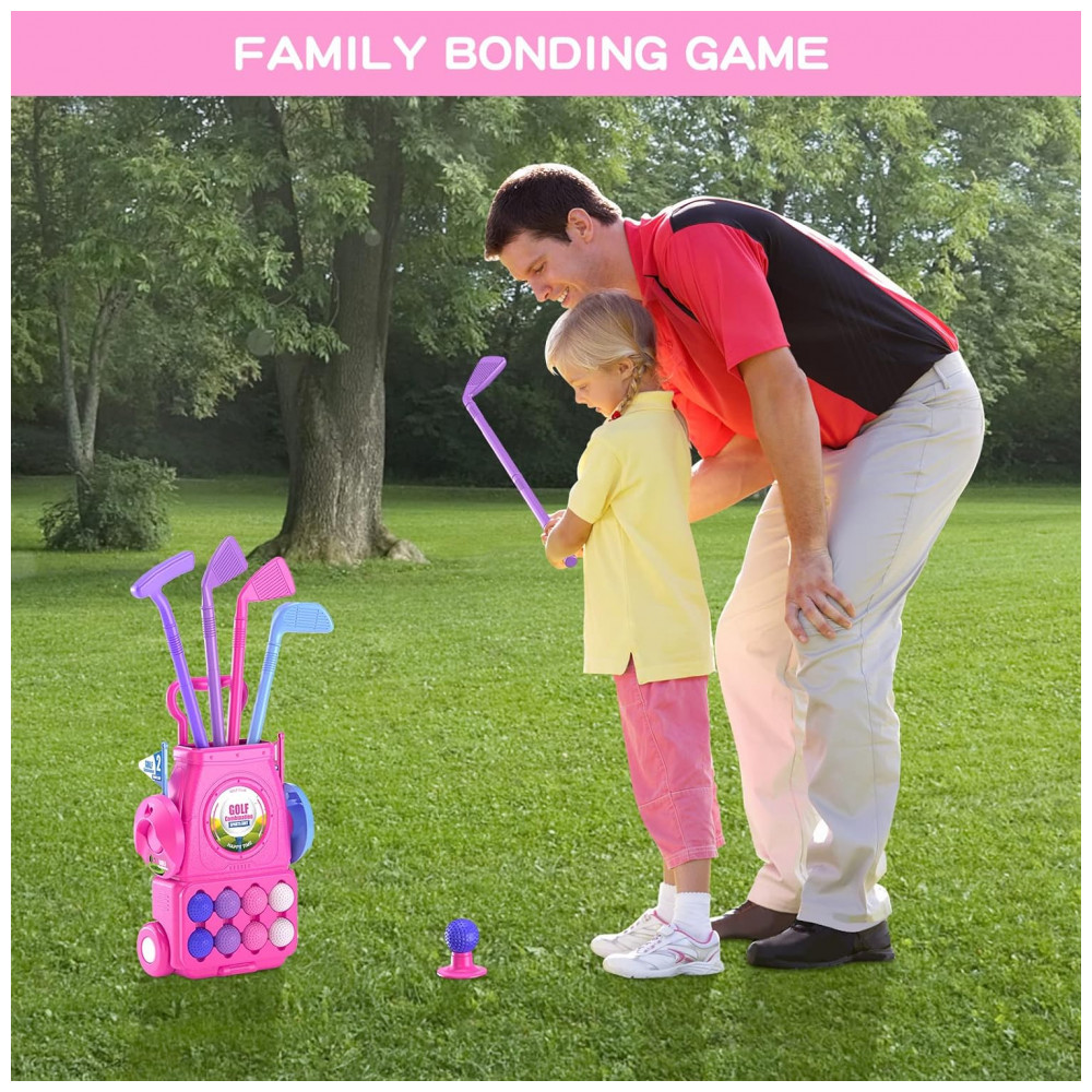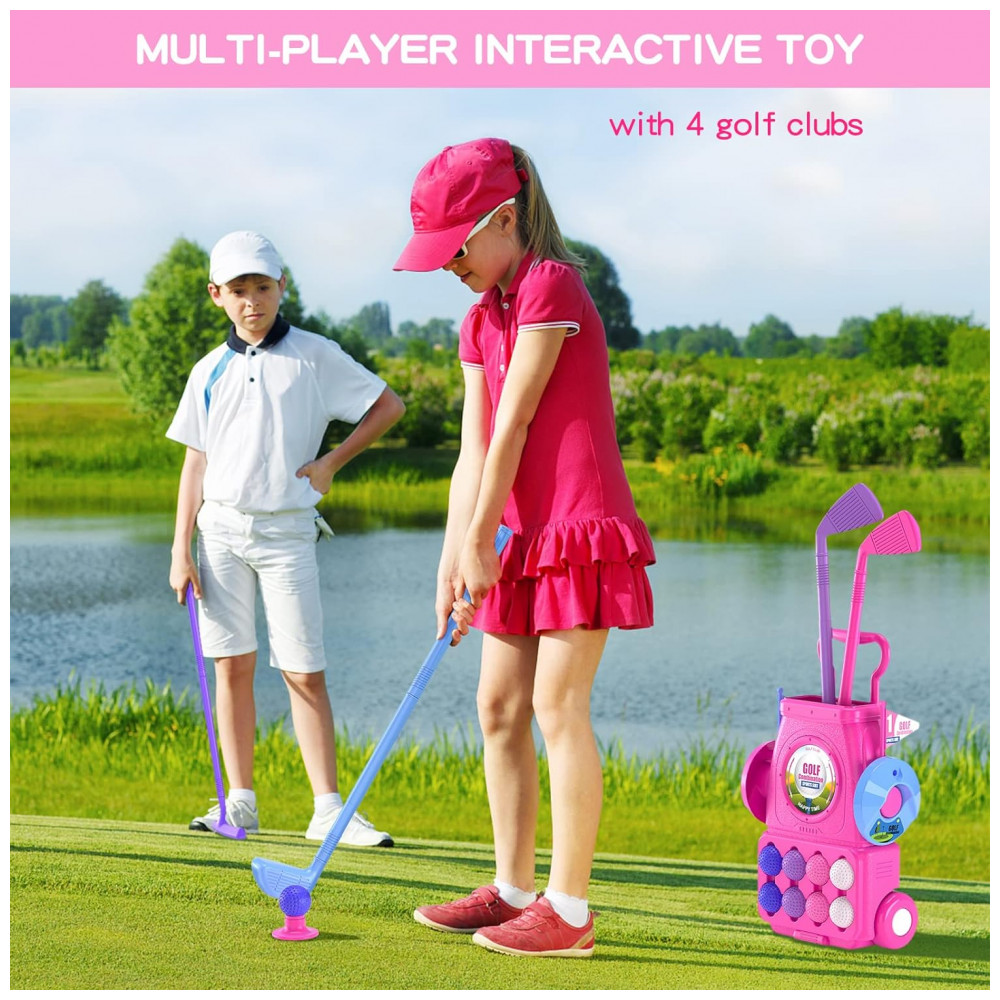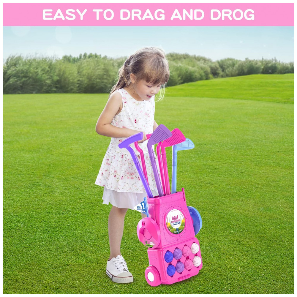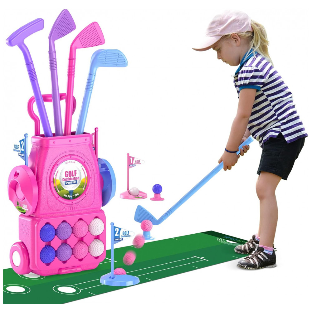 Conjunto de Tacos de Golfe Infantil com 8 Bolas Tapete e Carrinho com Rodas QDRAGON Rosa