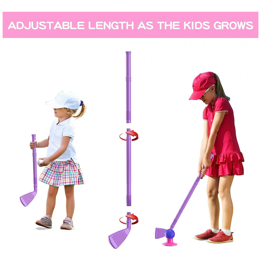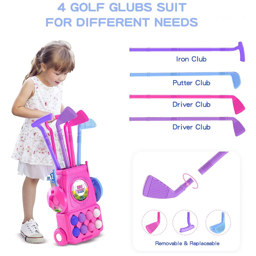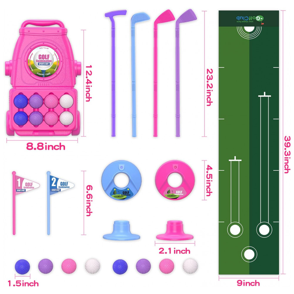 ATUALIZAR CONJUNTO DE TACOS DE GOLFE PARA CRIANÇAS O que você receberá 8 bolas de golfe, 4 tacos de golfe coloridos de diferentes formas e tamanhos, 2 buracos e bases de prática, 1 tapete de putting e 1 carrinho de golfe com 2 rodas para fácil arrastar e zenar, que é projetado para meninas com idades entre 1 a 8.