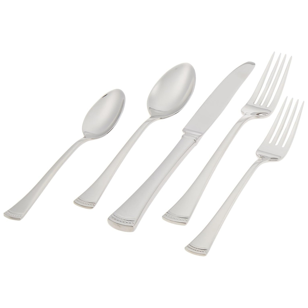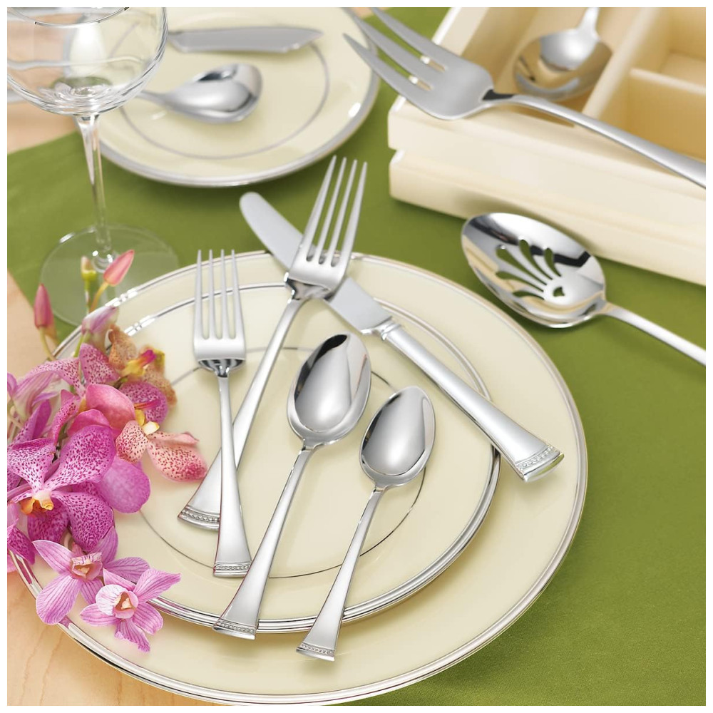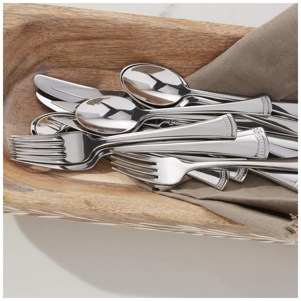 O conjunto de talheres Portola da Lenox é uma elegante opção de 65 peças, confeccionado em aço inoxidável brilhante 1810. Seu design apresenta alças alargadas com um delicado canal de contas na base, que conferem um toque sofisticado.