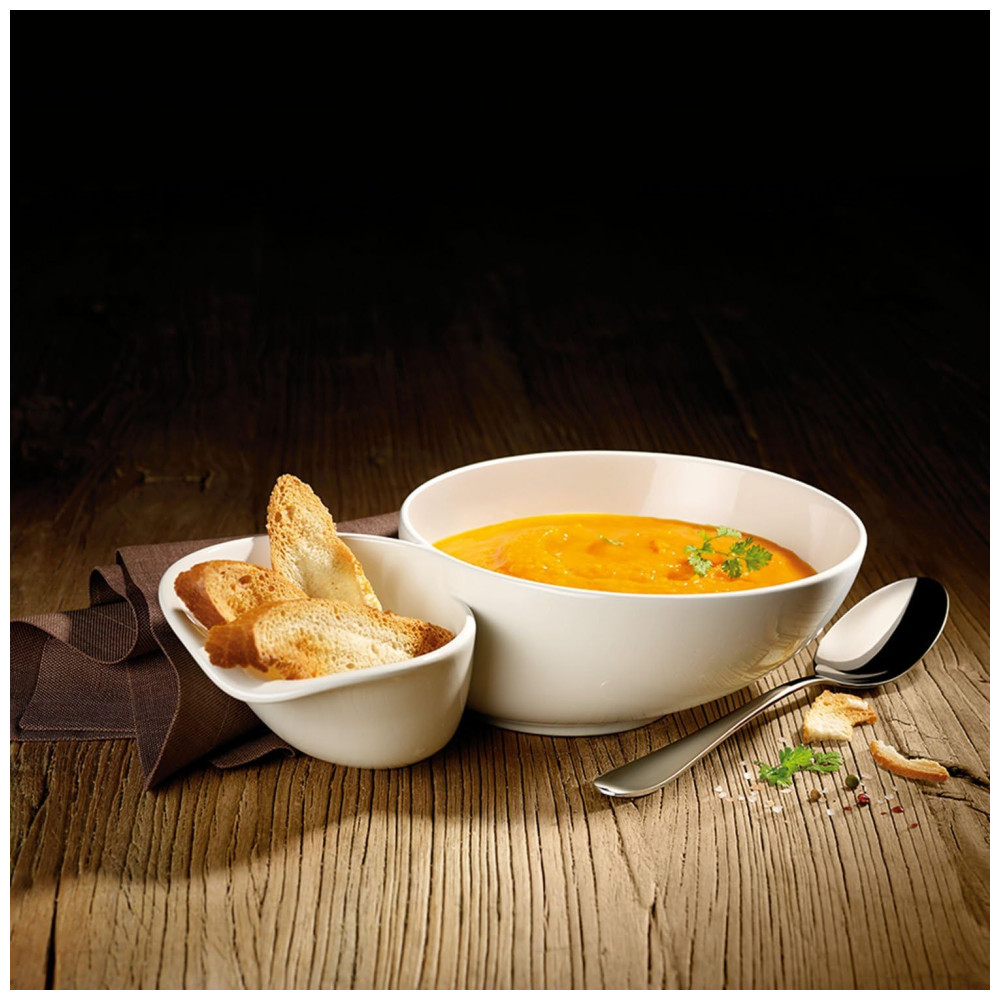 A tigela de sopa Villeroy & Boch Soup Passion foi projetada para oferecer uma experiência única ao saborear sua sopa, seja ela um caldo leve, uma sopa cremosa ou um ensopado encorpado. Com compartimentos integrados para pão, essa tigela é ideal para refeições completas, tornando-se perfeita para banquetes e momentos de confraternização com amigos e familiares. Ela possui dois compartimentos separados: um para a sopa e outro para o pão, além de um design inteligente com uma leve inclinação que permite saborear a última colherada com facilidade.