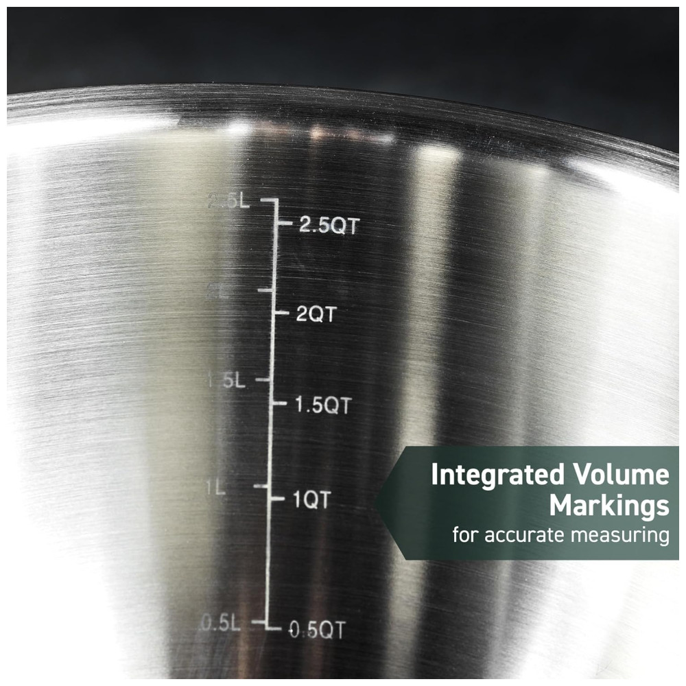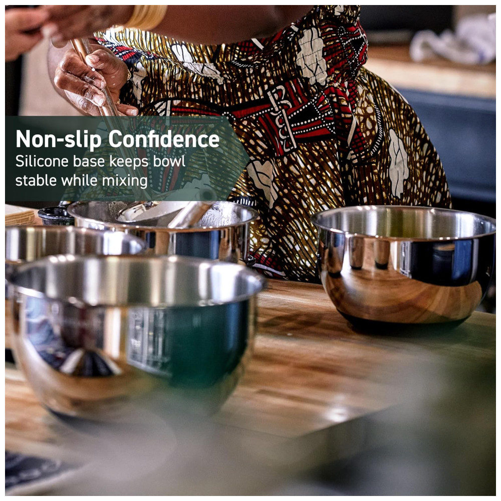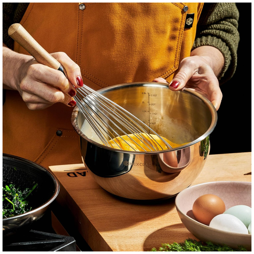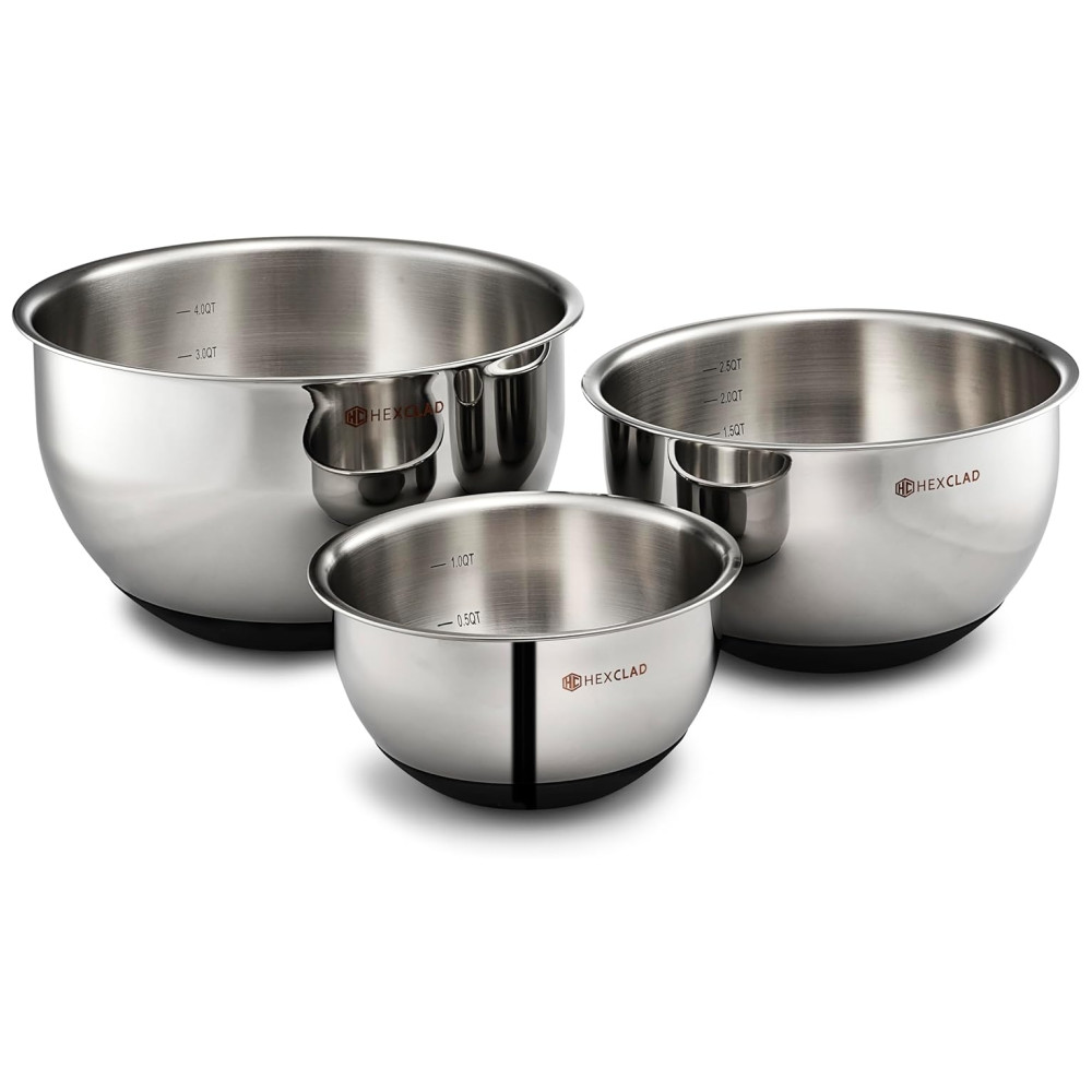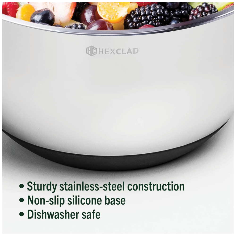 As tigelas de mistura HexClad são feitas de aço inoxidável durável de alta qualidade. Elas possuem uma base de silicone antiderrapante para que permaneçam no lugar enquanto você prepara, mistura e mexe seus alimentos, mesmo em ângulos.