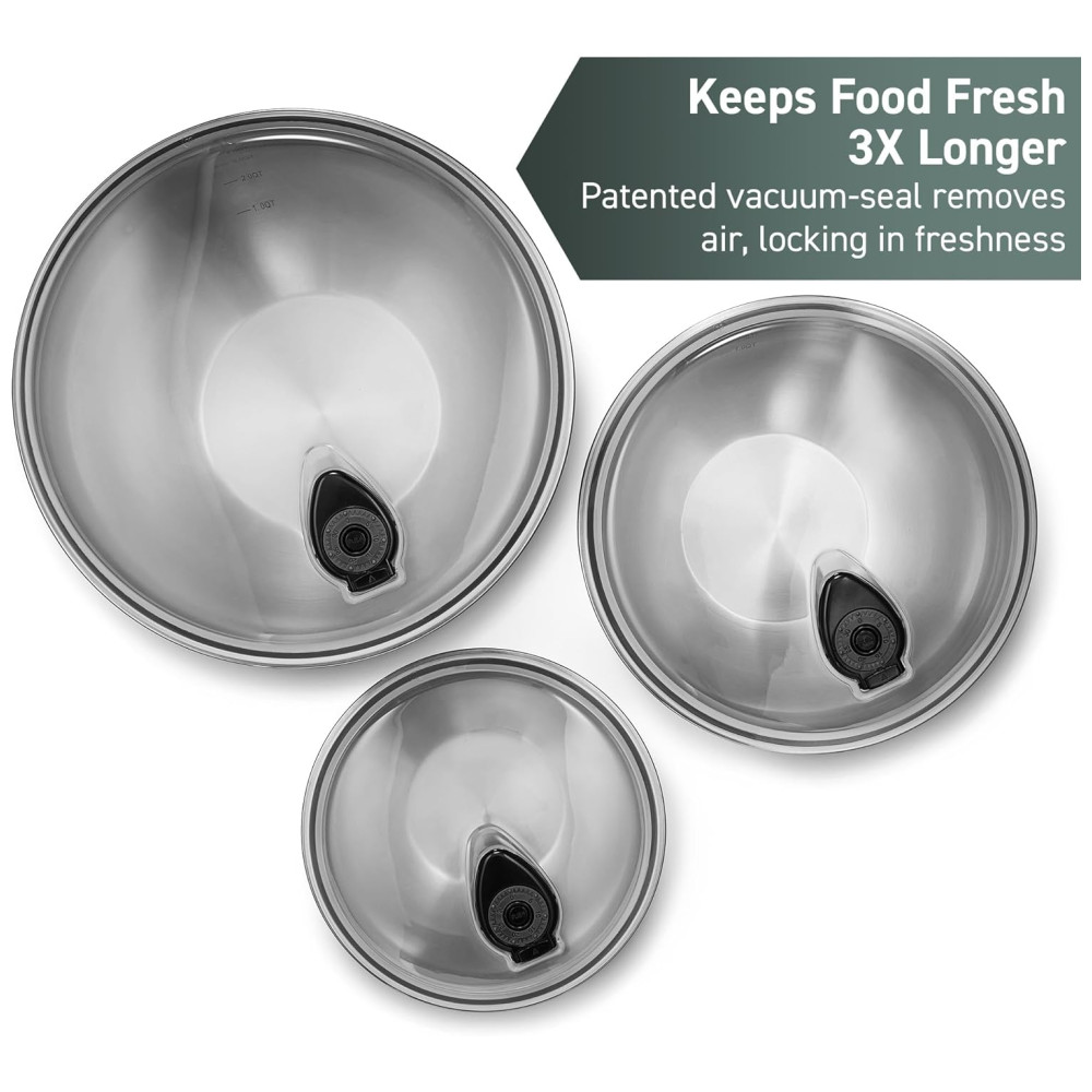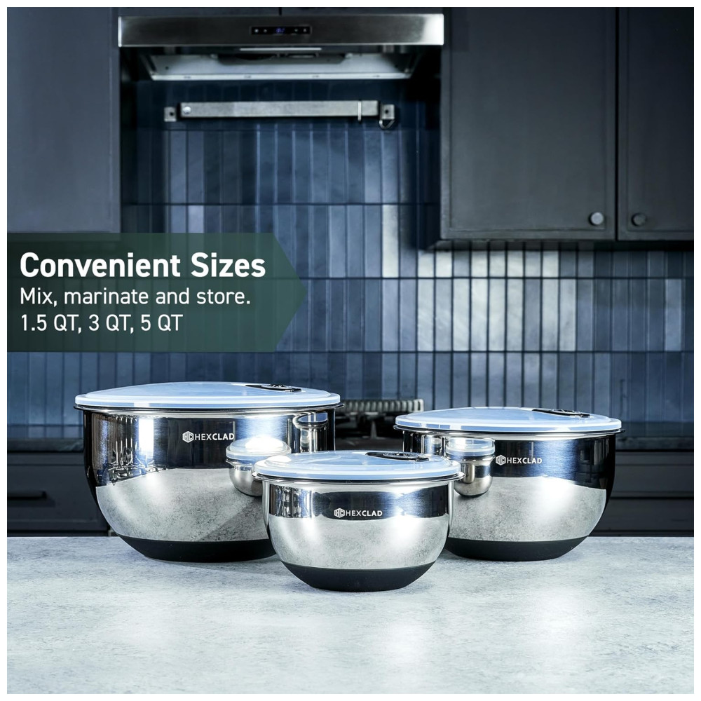 As Taças de Mistura HexClad vêm com tampas de vedação a vácuo patenteadas individuais para manter os alimentos frescos no dia em que você os preparou. O zenamento hermético é ideal para refrigerar e marinar, mantendo os alimentos s.