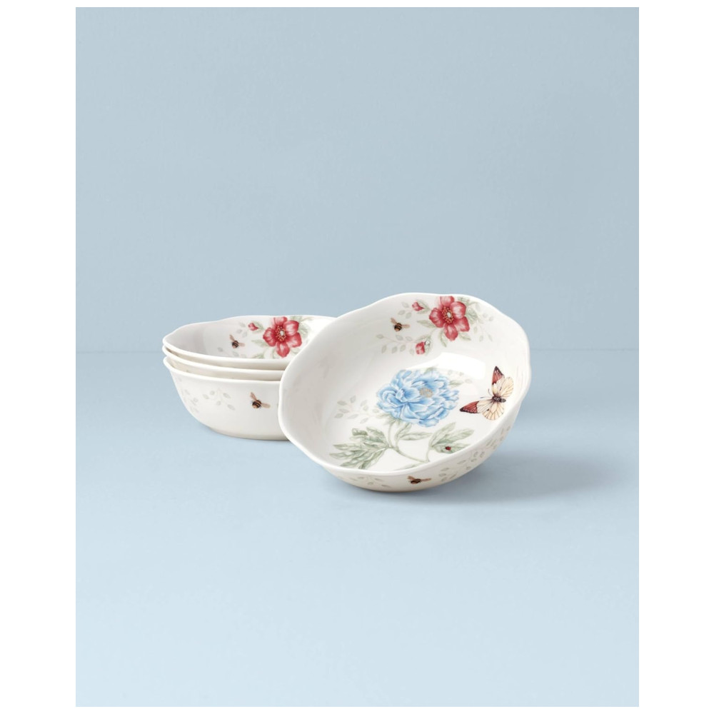 Feitas de porcelana cerâmica durável, as tigelas são práticas, podendo ser usadas tanto no micro-ondas quanto na máquina de lavar louça. A coleção Butterfly Meadow inclui 4 tigelas de sopa, cada uma com 22 cm de diâmetro e capacidade de 950mL.