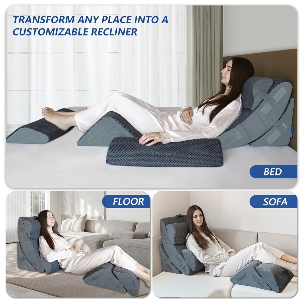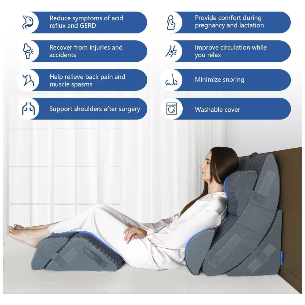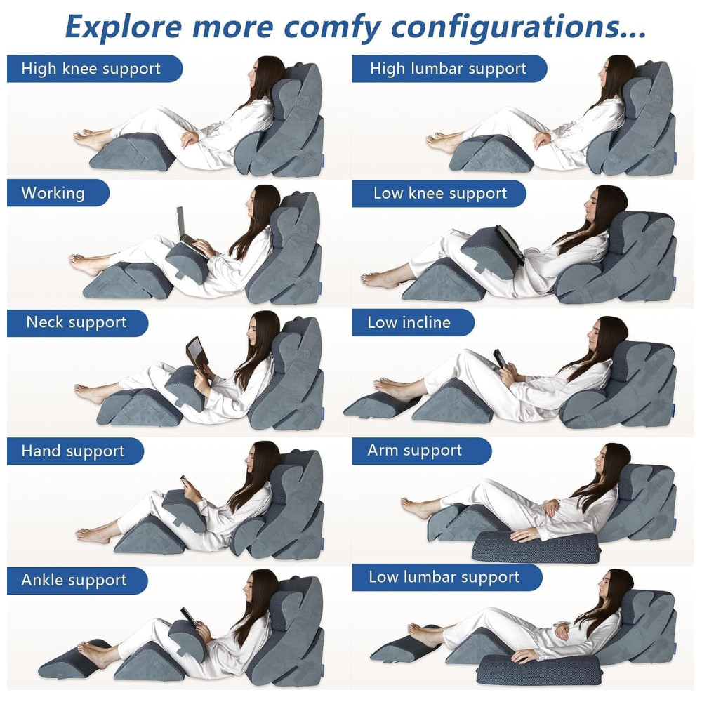 Este conjunto de travesseiros de cunha é ideal para pessoas que estão se recuperando de cirurgias ou que sofrem de dores nas costas, pernas, ombros e pescoço, espasmos musculares, refluxo ácido, DRGE, azia, ronco, inchaço, problemas digestivos e respiratórios. Com um design ergonômico de 24 em 1, você pode usá lo de mais de 24 maneiras diferentes para atender às suas necessidades. Ele é inclinado ergonomicamente para fornecer suporte completo enquanto você lê, assiste TV ou trabalha na cama, no sofá ou no chão. Este travesseiro é feito de espuma de memória macia com partículas de gel para garantir conforto e frescor mesmo após uso prolongado. As capas externas são facilmente removíveis e laváveis à máquina, e o conjunto vem com uma bolsa de viagem para transporte e armazenamento convenientes. O conjunto de travesseiros KingPavonini é um presente atencioso para companheiros de enfermaria, familiares ou amigos. Observe que o travesseiro KingPavonini é embalado a vácuo para melhor transporte e deve ser deixado por 6 a 12 horas para expandir completamente. Compre com confiança e descanse tranquilo com ele para não mais noites sem dormir