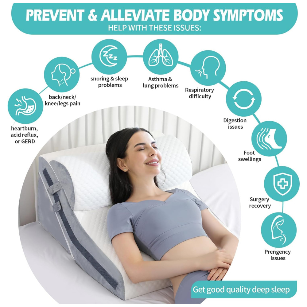O conjunto de 3 peças eleva e apoia diversas partes do corpo, incluindo cabeça, pescoço, costas e pernas, promovendo bem-estar geral. Ideal para quem sofre de refluxo ácido, apneia do sono, DRGE, hérnia de hiato, congestão nasal, tosse noturna e inchaços pós-operatórios.