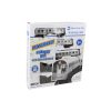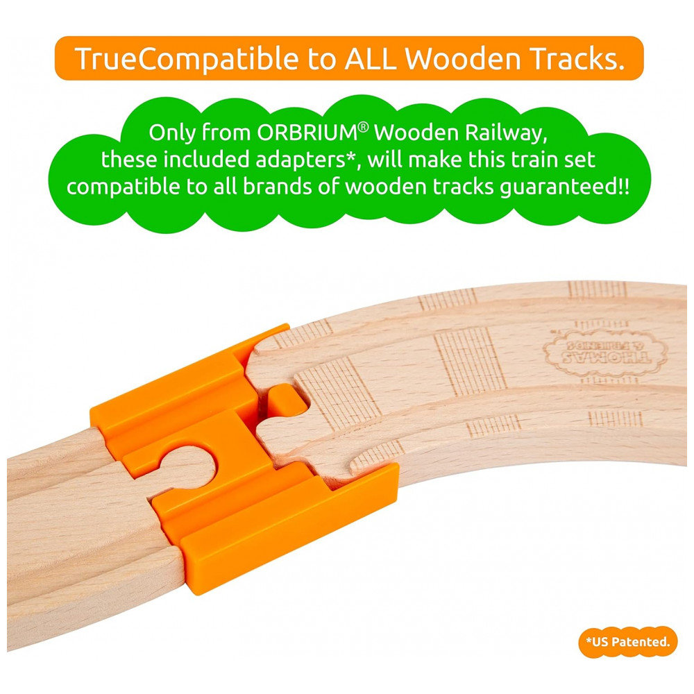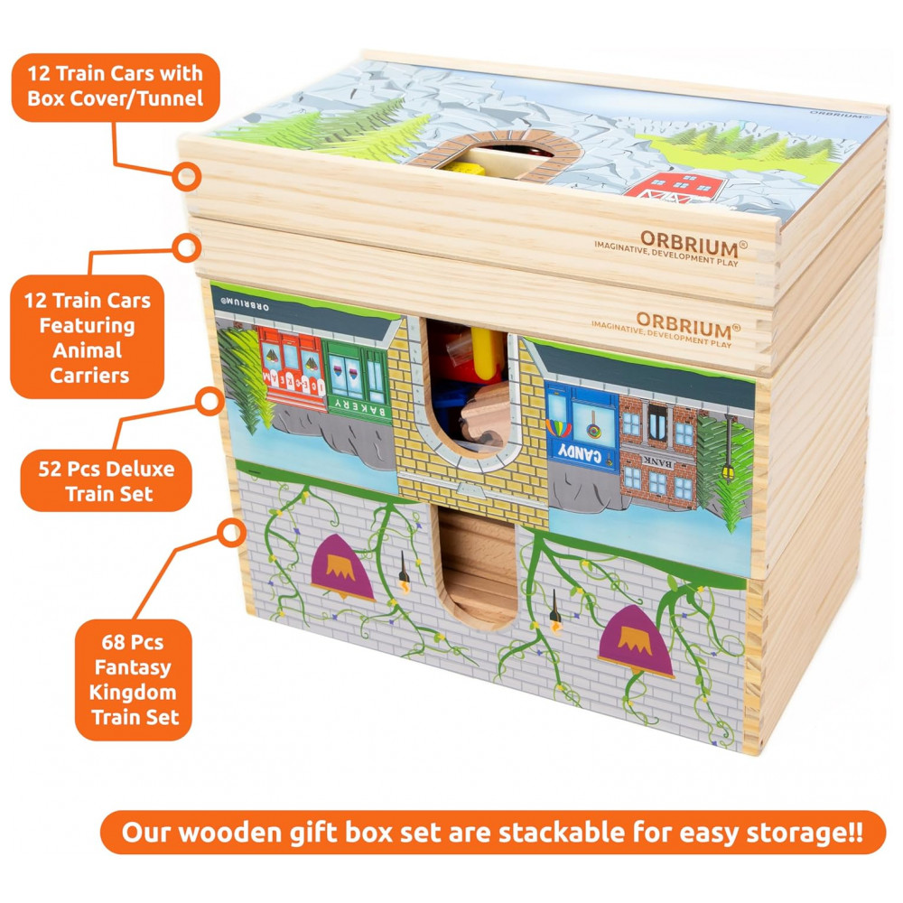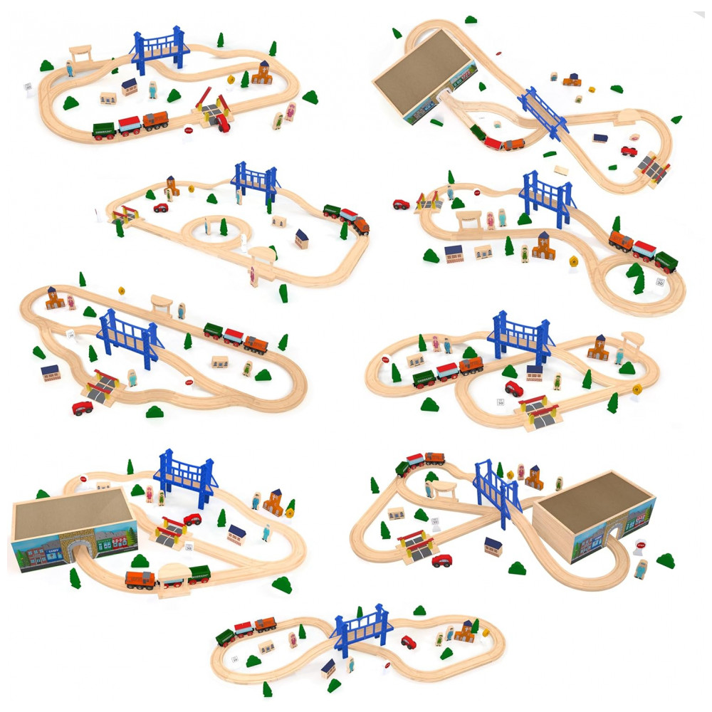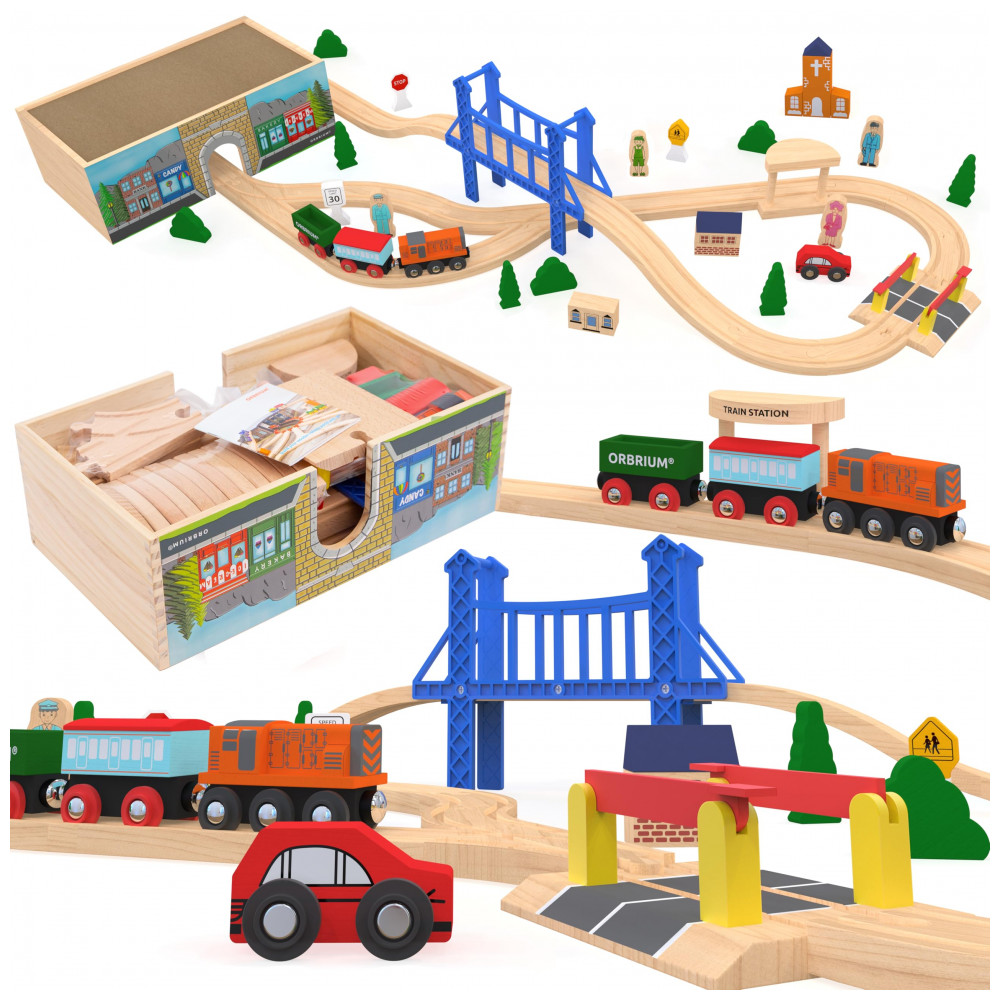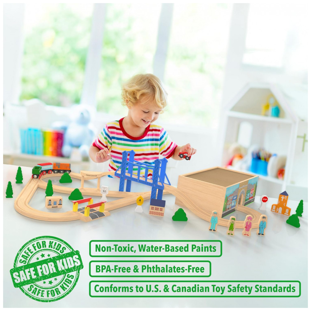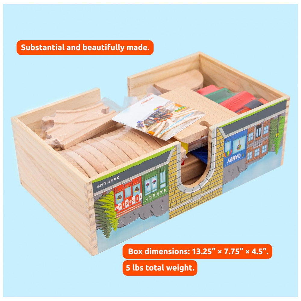 O conjunto completo de 52 peças inclui trilhos de madeira premium, motor, ônibus de passageiros, carro funil, automóvel, edifícios, estatuetas, sinais de trânsito, árvores e arbustos.