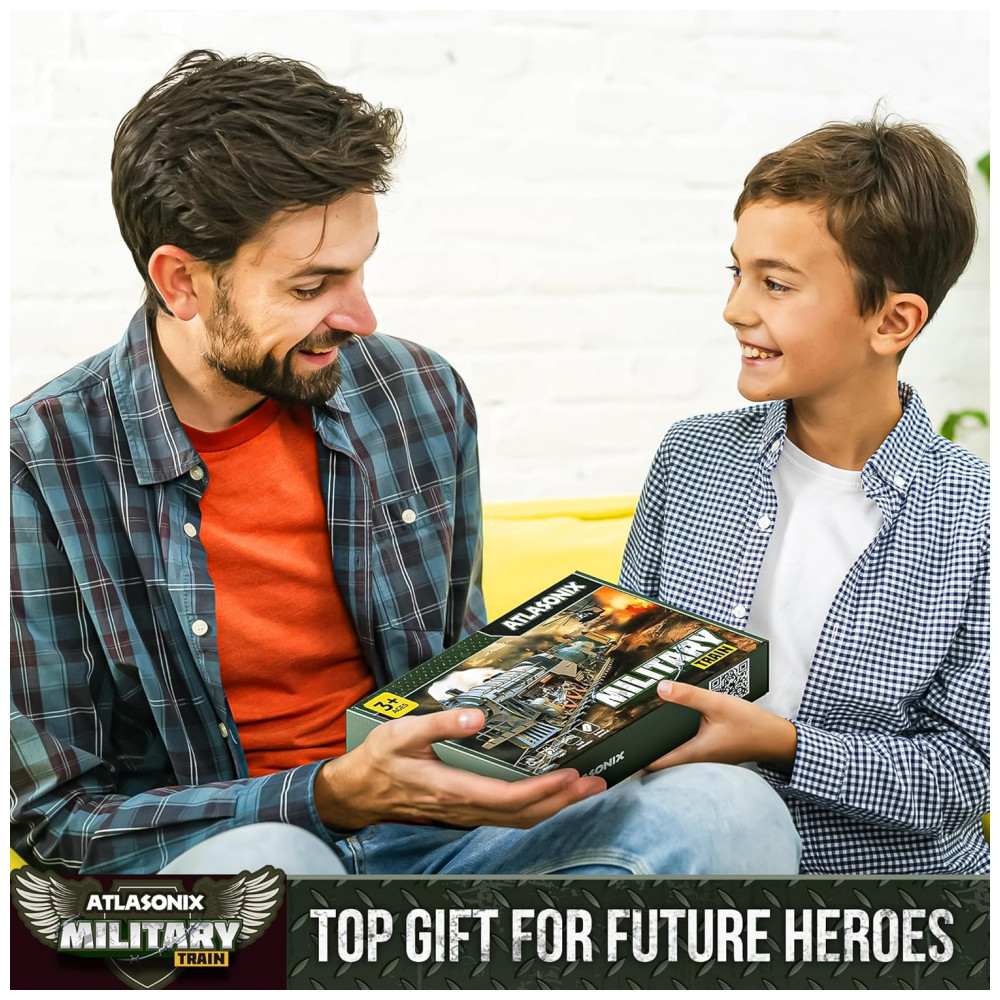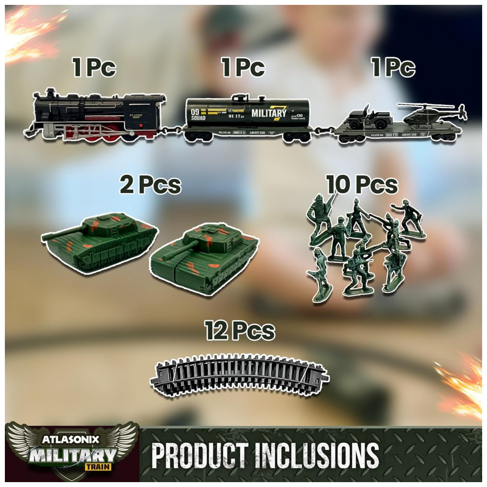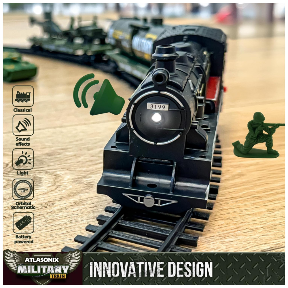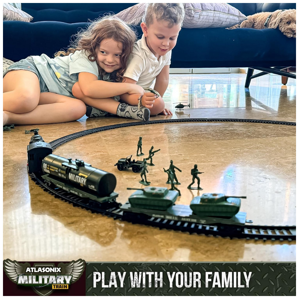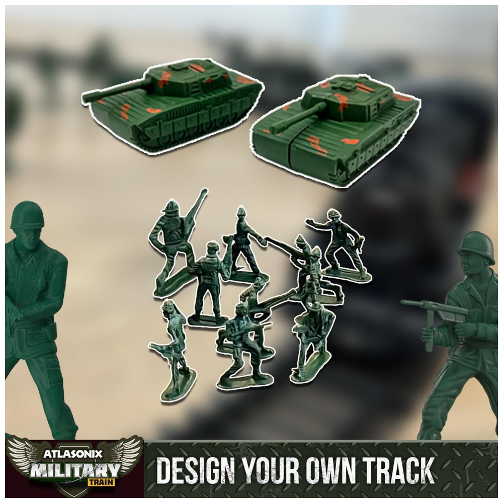 Conjunto de Trenzinho de Brinquedo com Helicóptero Tanque Soldados e Trilhos para Crianças de 3 a 8 anos Atlasonix Preto