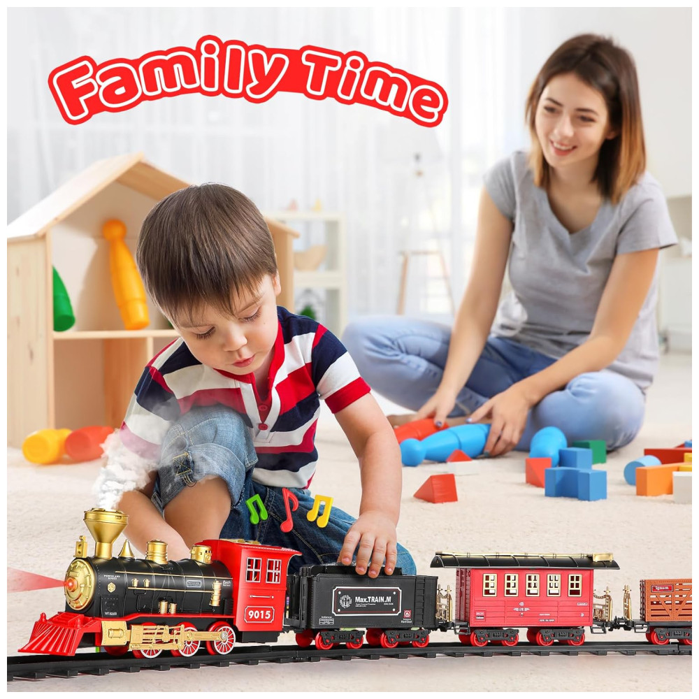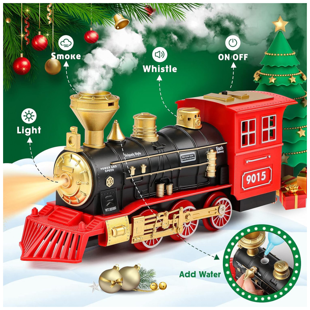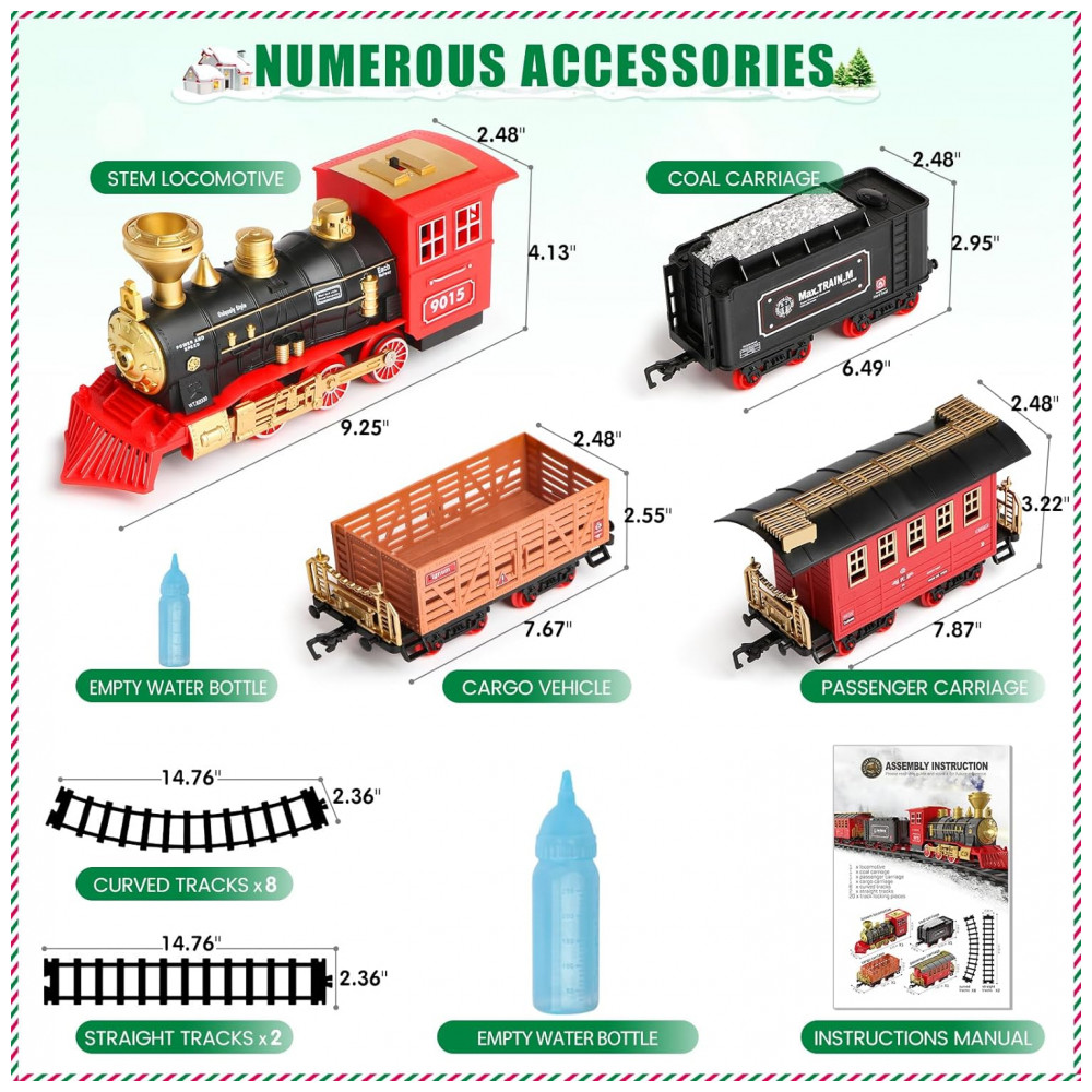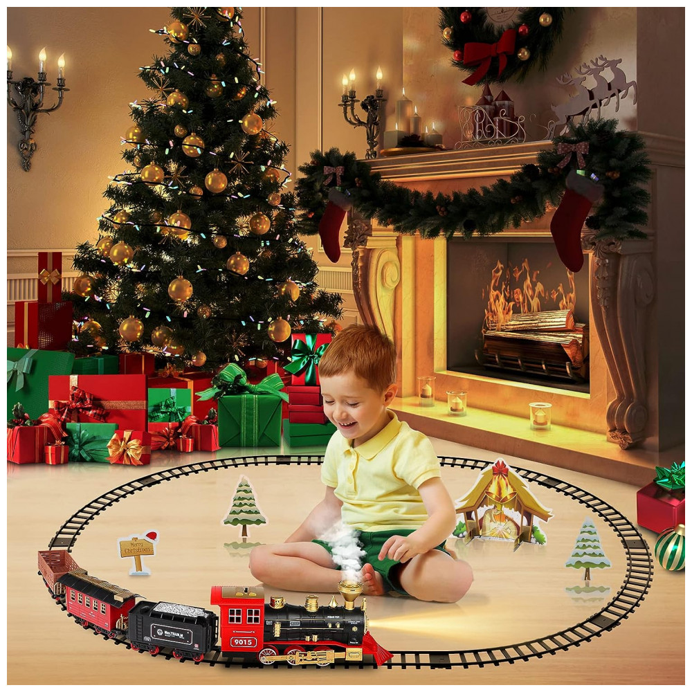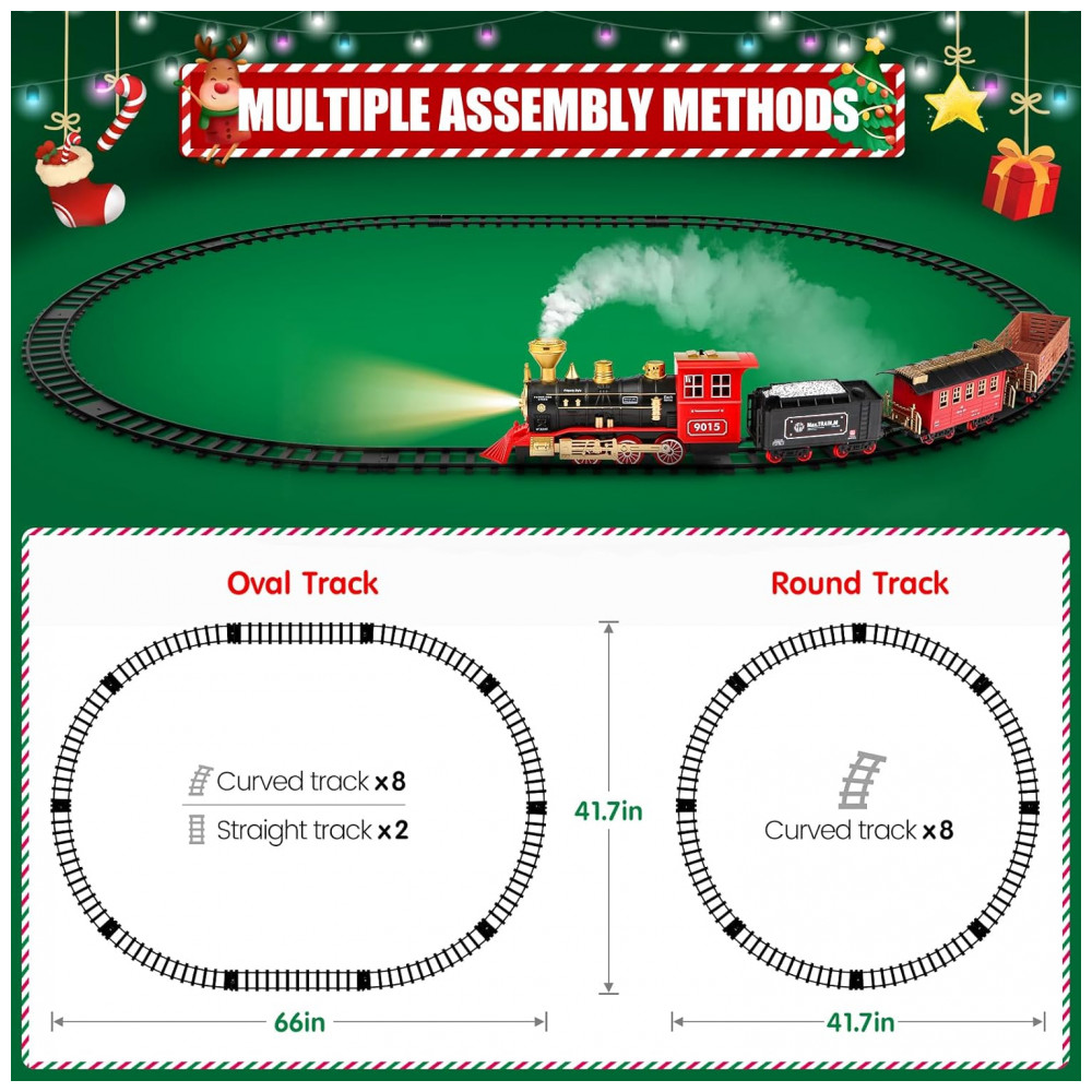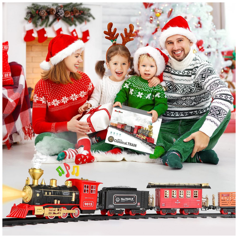 CONJUNTO DE TRILHA DE TREM MODELO CLÁSSICO O requintado conjunto de trem para árvore de Natal vem com uma locomotiva a vapor, um vagão de passageiros, um vagão de carvão, um veículo de carga, 8 trilhos curvos e 2 trilhos retos. Ligue o trem de brinquedo para iniciar os divertidos jogos de trem. Seus filhos e sua família vão adorar assistir os conjuntos de trem para meninos de 2 a 4 anos se movimentando. Você não apenas pode manter seus filhos se divertindo por horas, mas também melhorar sua inteligência e exercitar a coordenação olho mão.