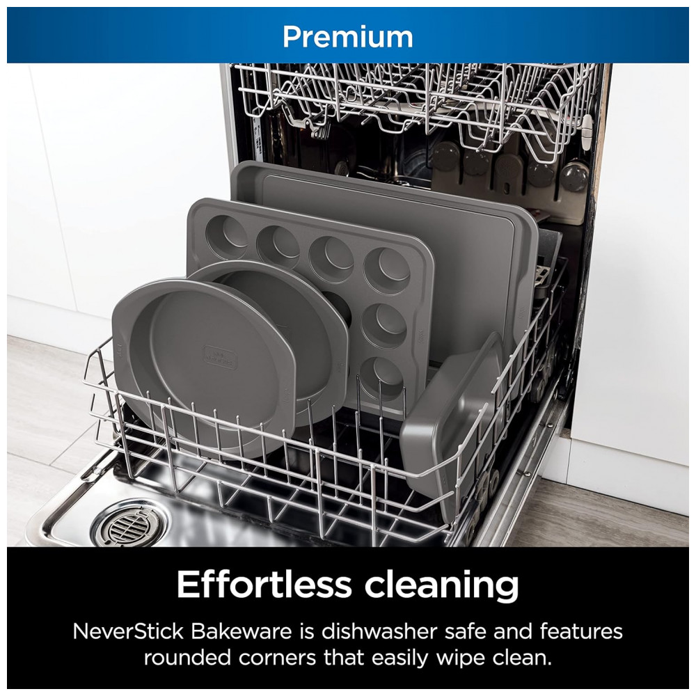 O kit inclui assadeira retangular grande, forma de bolo inglês, forma de muffin com 12 cavidades e duas formas redondas, cobrindo as principais demandas de panificação doméstica. As bordas ergonômicas garantem melhor pegada com luvas, enquanto o acabamento cinza confere aparência uniforme ao conjunto e facilita a identificação como linha NeverStick Premium.