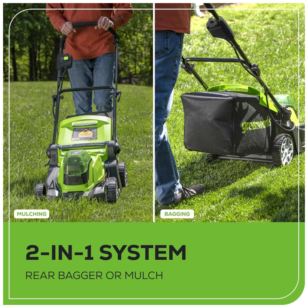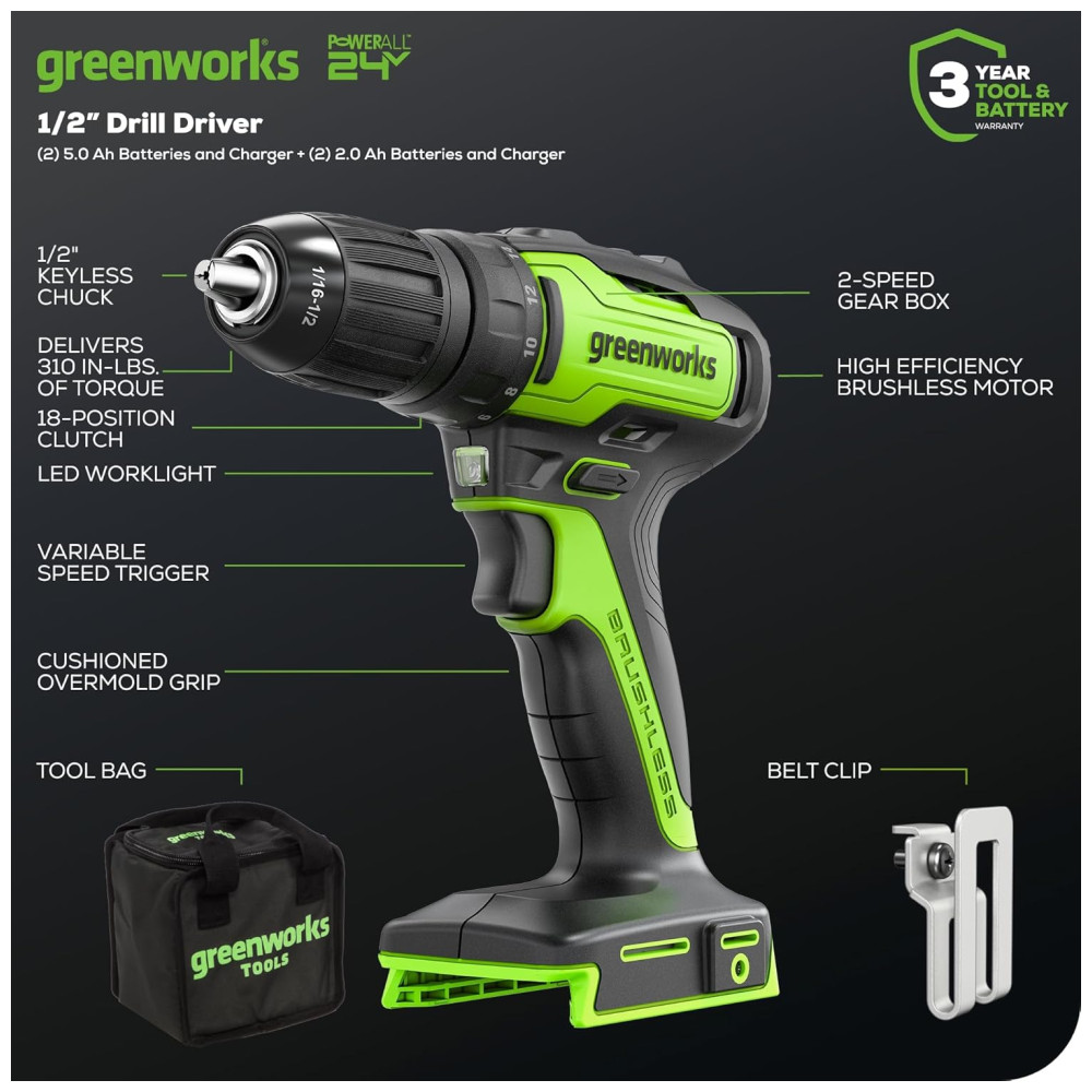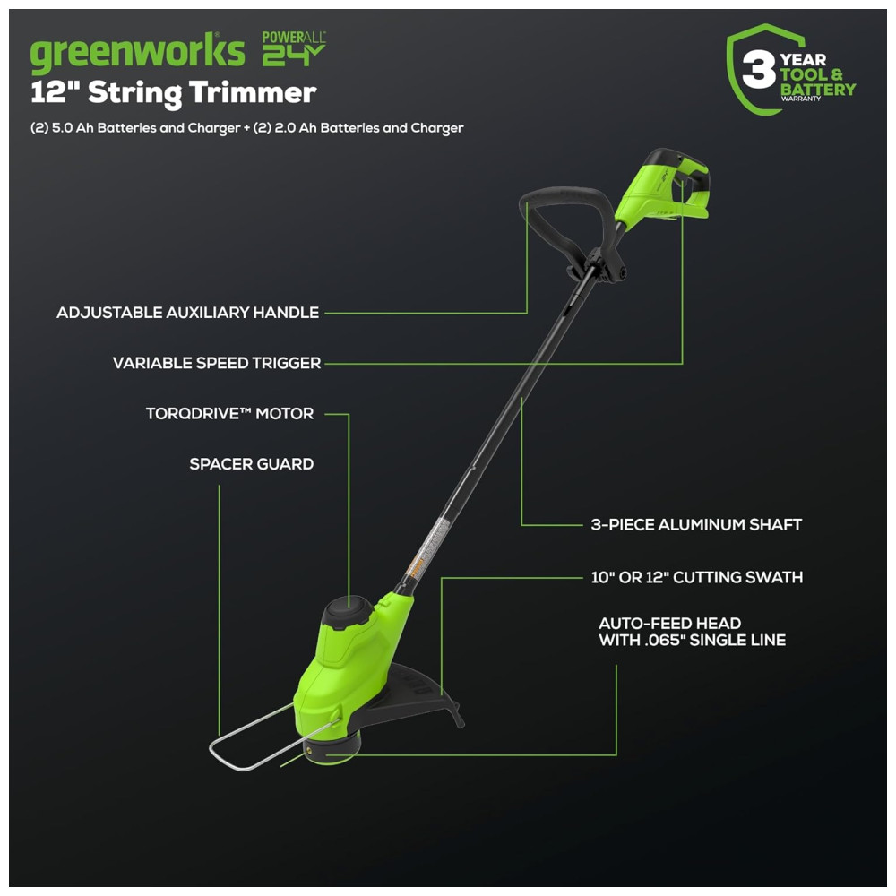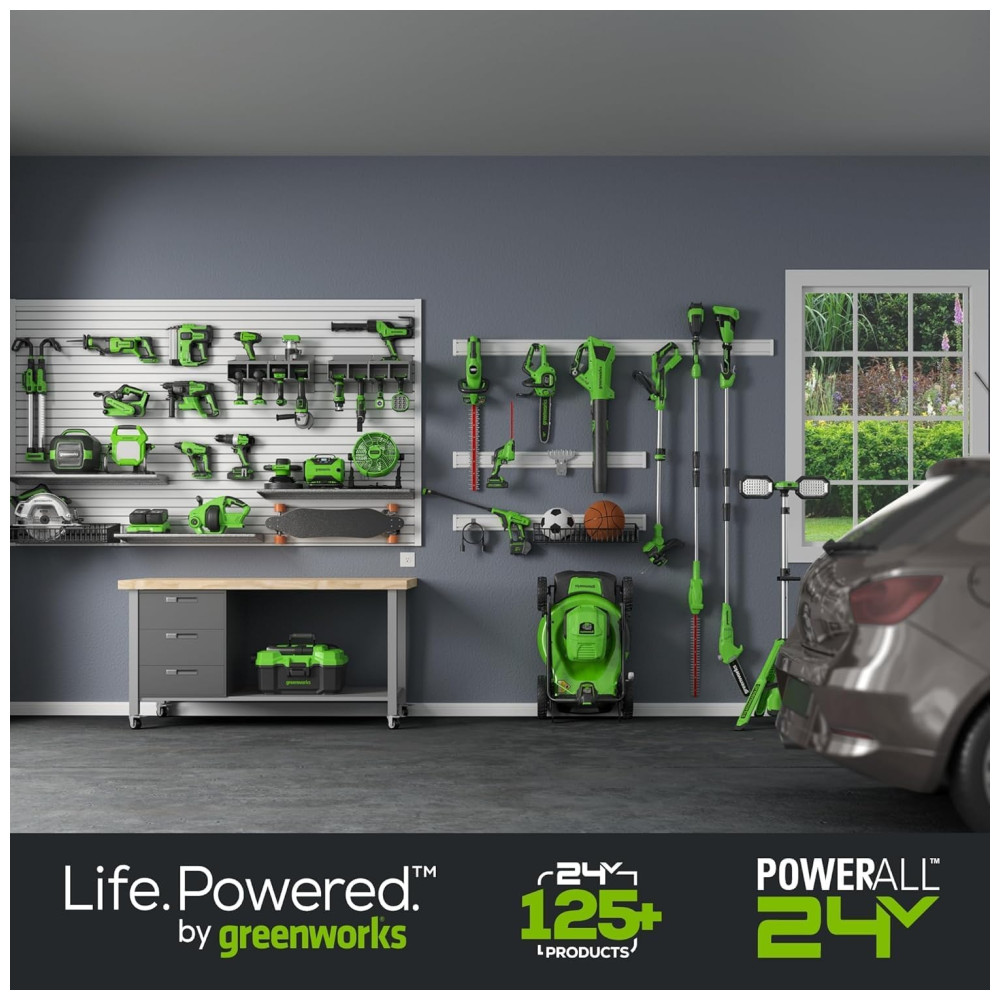 Avançado e eficiente, o cortador de grama deste kit Greenworks conta com um robusto sistema de 2x24Volts e deck de poli para maior durabilidade. Possui um sistema versátil 2-em-1, permitindo tanto a mulching quanto a coleta traseira. Seu ajuste de altura em 6 posições atende diversas preferências de gramado, e o motor sem escovas garante eficiência. O aparador de grama possui corte para trabalhos precisos. Equipado com um motor escovado e linha de corte para acabamento eficaz. O sistema autofeed oferece conveniência, facilitando a manutenção do desempenho contínuo. Já o soprador, alimentado por um motor escovado, capaz de fornecer 320CFM e velocidades de até 90MPH. Oferece até 20 minutos de tempo de execução, ideal para tarefas rápidas. Seu design ultraleve e o seletor de velocidade variável aprimoram o conforto do usuário. A furadeira possui transmissão de 2 velocidades 0-380RPM/0-1450RPM, 310 in lbs de torque, e embreagem de 18+1 posições com mandril sem chave de 12 pol. Oferece controle preciso de velocidade e ajuste de torque ao perfurar e parafusar em diferentes superfícies, com luzes LED embutidas que iluminam espaços pouco iluminados. O kit inclui 2 baterias de 4Ah, 2 baterias de 2Ah, um carregador de dois slots e um carregador único de 2A. Garante uso prolongado e eficiência. O design de dupla porta permite o carregamento simultâneo de duas baterias, minimizando o tempo ocioso e aumentando a produtividade. Este conjunto abrangente oferece tudo o que você precisa para cuidar do seu jardim de forma eficaz, com cortador para corte de grama eficiente, aparador para acabamento preciso e soprador para limpeza rápida. Completa o kit uma furadeira potente, perfeita para tarefas diárias e projetos DIY. Tudo alimentado por um sistema de bateria unificado para operação contínua. Itens inclusos: 1 Cortador de Grama, 1 Aparador de Grama, 1 Soprador, 1 Furadeira, 2 Baterias de 24V 4Ah, 2 Baterias de 24V 2Ah, 1 Carregador Dual Slot 2A, 1 Carregador 2A.