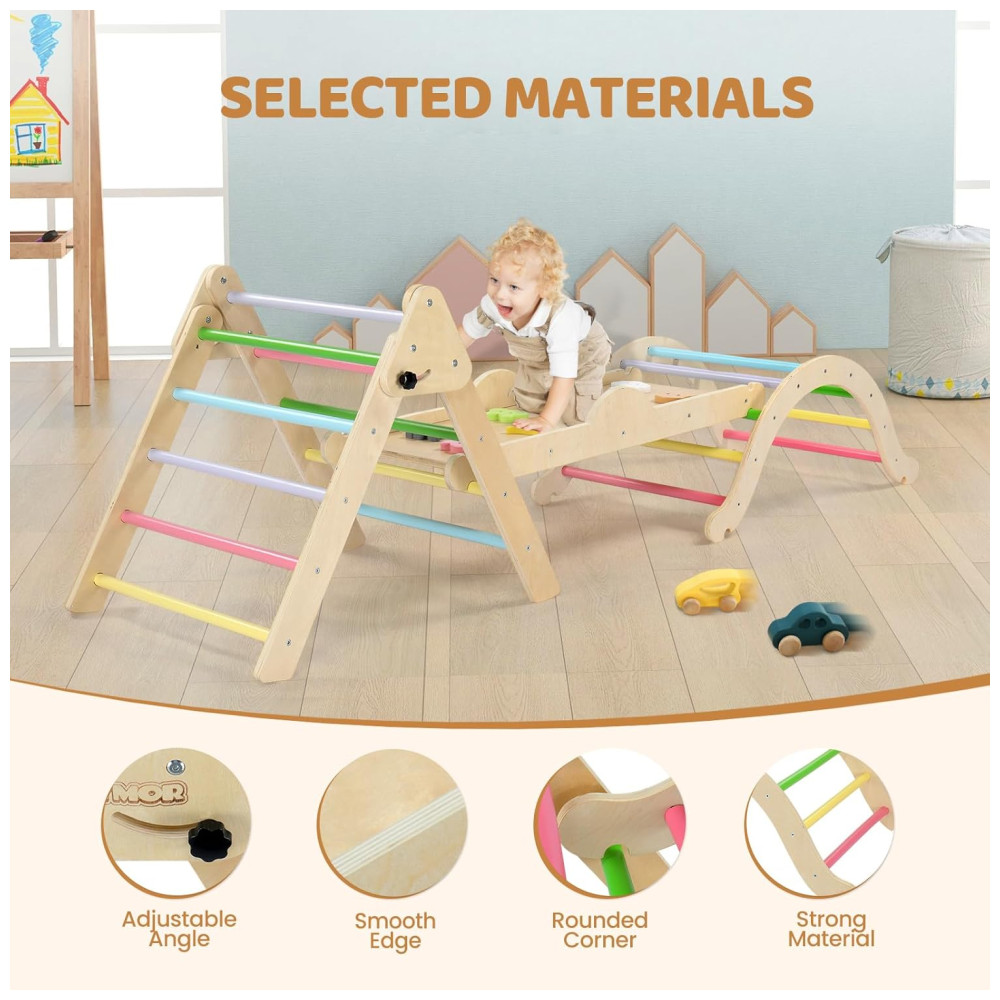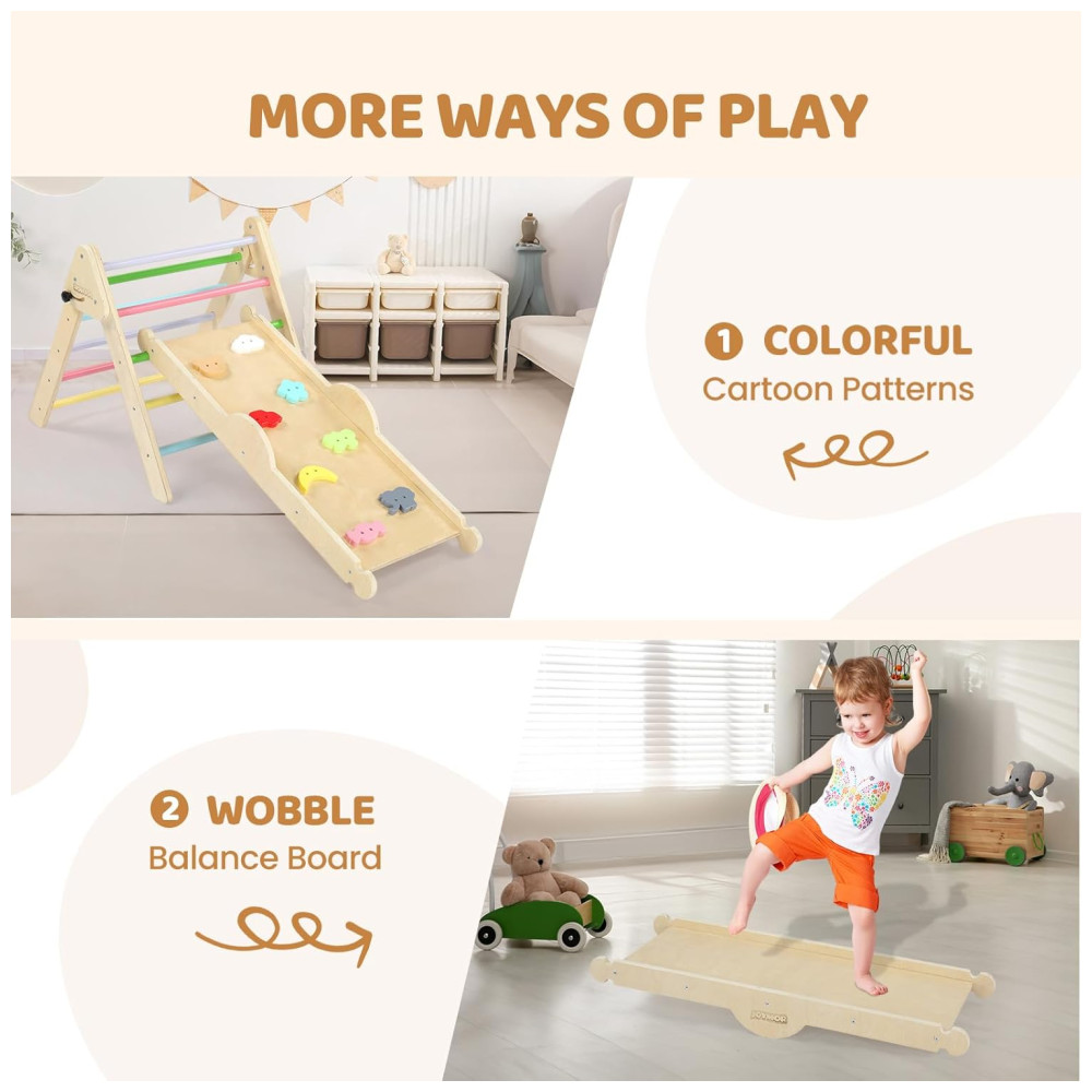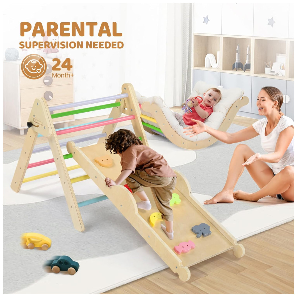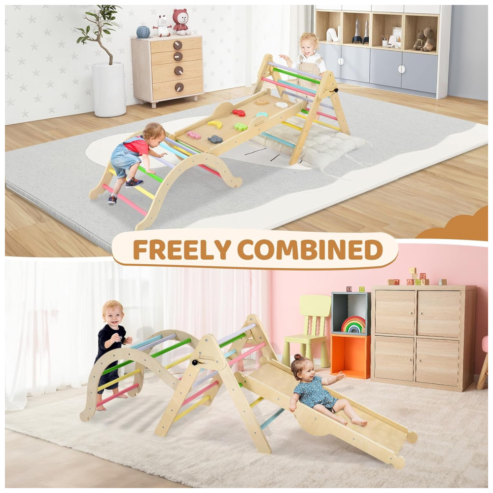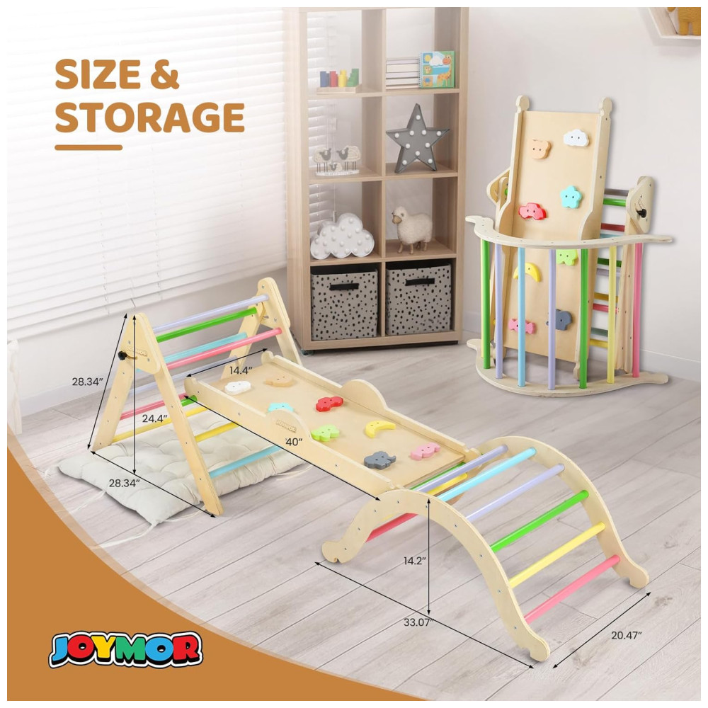 O conjunto de triângulo Pikler da JOYMOR oferece múltiplas funções para diversão e desenvolvimento das crianças. Inclui uma escada dobrável, um conjunto de escalada em arco, uma parede de escalada, um escorregador, uma almofada de revestimento de algodão puro e dois carros de madeira feitos à mão. Este ginásio de madeira pode ser combinado de mais de 10 maneiras diferentes, proporcionando mais de 10 combinações para as crianças se divertirem escalando. Com um design exclusivo, o conjunto incorpora o conceito educacional Montessori, trazendo elementos do cotidiano para os brinquedos. As pedras de escalada possuem cores e padrões diferentes para ajudar as crianças a desenvolver a cognição enquanto brincam. As cores foram cuidadosamente selecionadas para auxiliar no desenvolvimento da visão e percepção de cores das crianças. Além disso, o conjunto inclui uma almofada de algodão puro para transformar o conjunto em um balanço de arco, proporcionando conforto para as sonecas das crianças. A segurança é uma prioridade, com ajuste de ângulo fácil na escada e bordas polidas para evitar rebarbas. Cada peça de madeira foi cuidadosamente selecionada para garantir resistência e integridade. O material principal é madeira natural, tornando o produto não tóxico e ecologicamente correto.