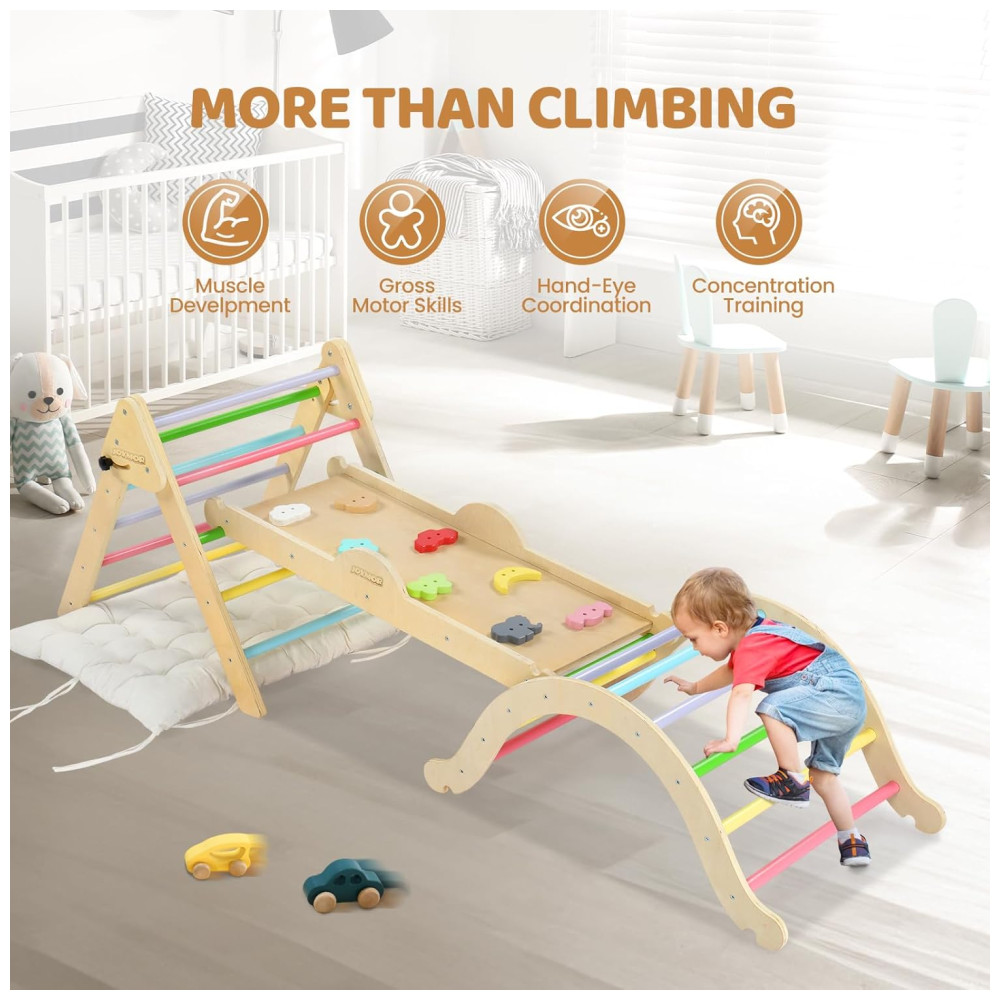 Conjunto JOYMOR 9 em 1 de Triângulo Pikler com Almofada Grande Conjunto de Escalada de Madeira Montessoriano para Crianças com Pedras Coloridas Bala