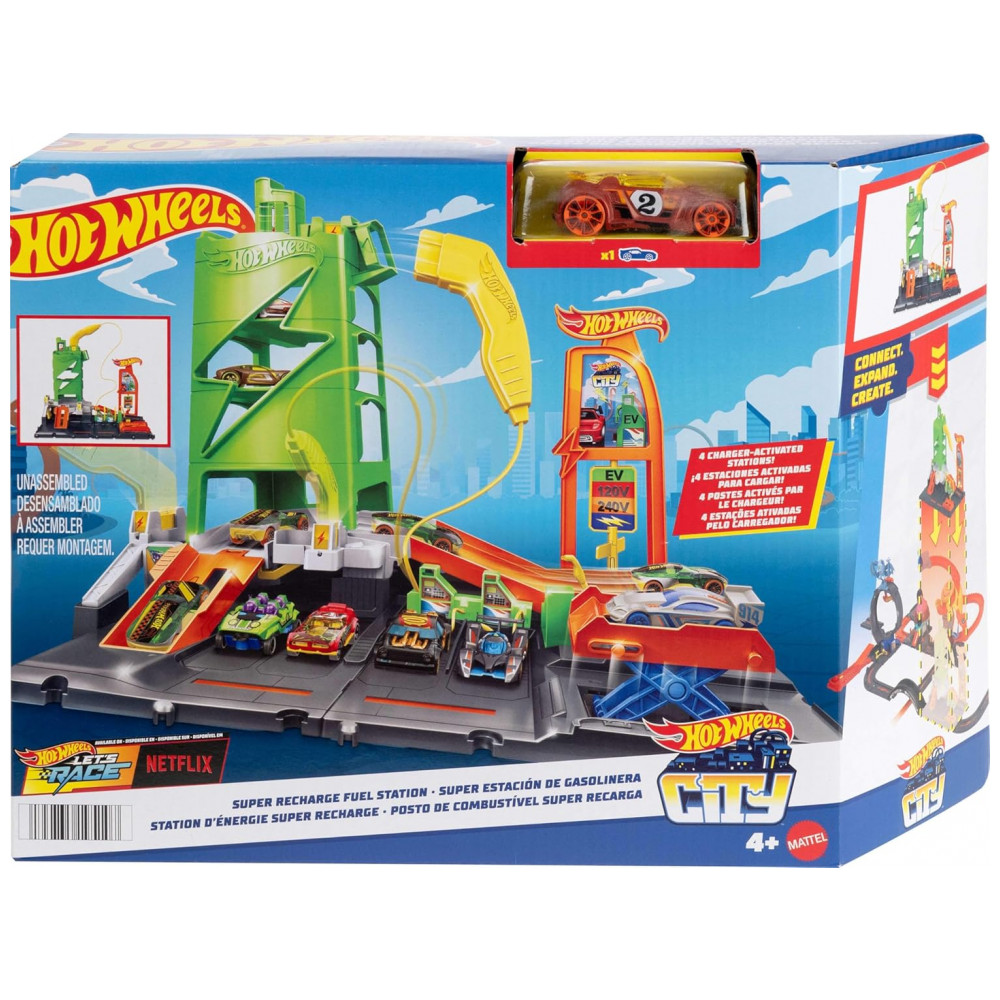 Componentes incluídos Inclui 1 conjunto de posto de combustível Hot Wheels City Super Recharge e 1 carro Hot Wheels em escala 1 64.