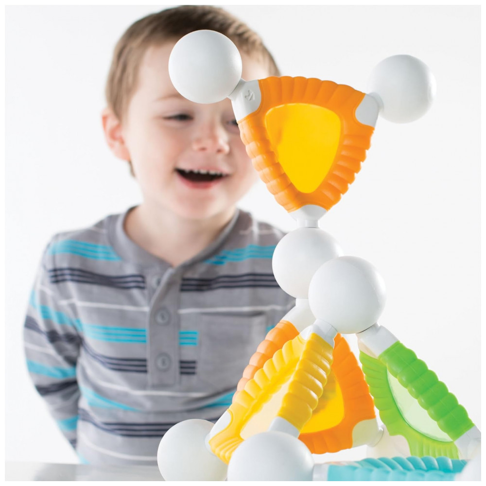 As janelas translúcidas coloridas favorecem atividades com luz natural ou sobre mesas de luz, permitindo observar cores, sobreposições e formas em 2D e 3D. As conexões magnéticas entre barras e esferas possibilitam construções lineares, estruturas verticais e padrões orgânicos, apoiando objetivos de exploração STEM na primeira infância.