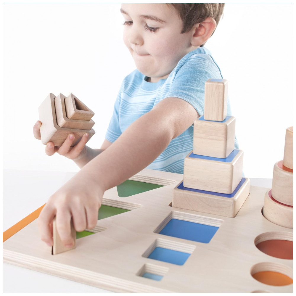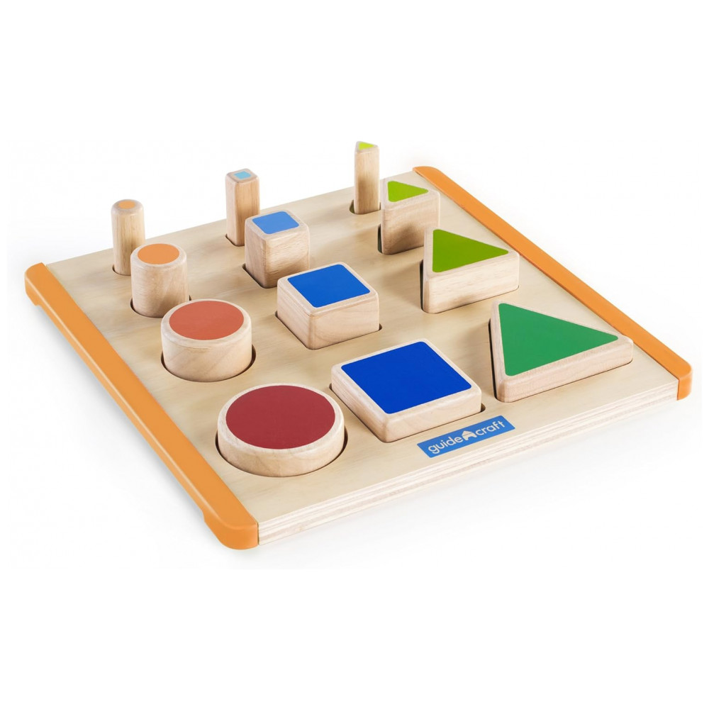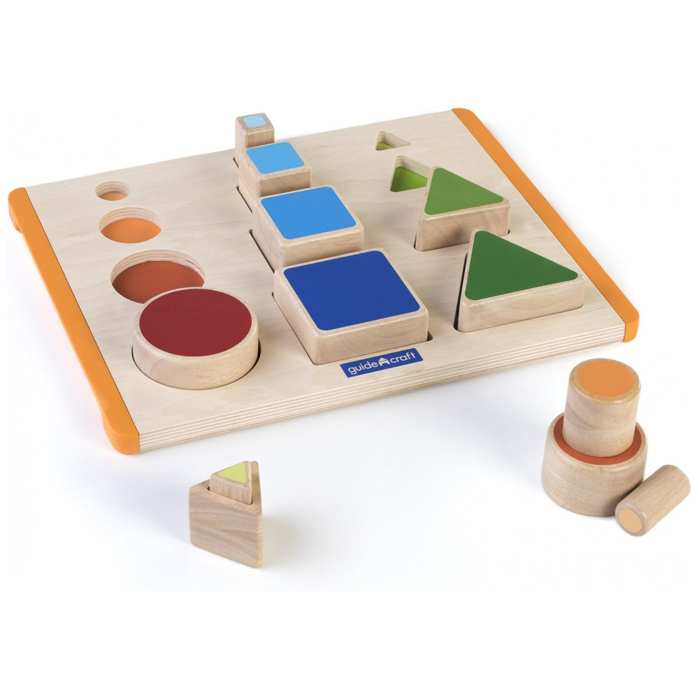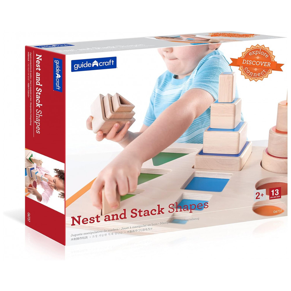 O Guidecraft Nest and Stack Shapes é um brinquedo educativo de encaixe e empilhamento desenvolvido para crianças a partir de 2 anos, com foco em coordenação motora fina, destreza e raciocínio espacial. O tabuleiro em madeira possui cavidades autoexplicativas nas quais as crianças podem encaixar, empilhar ou agrupar blocos coloridos em diferentes formatos geométricos.