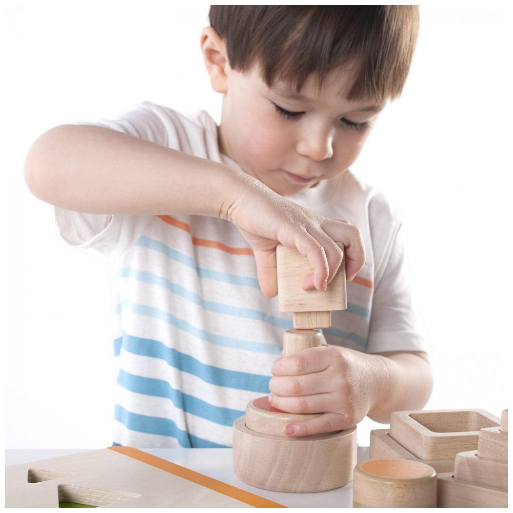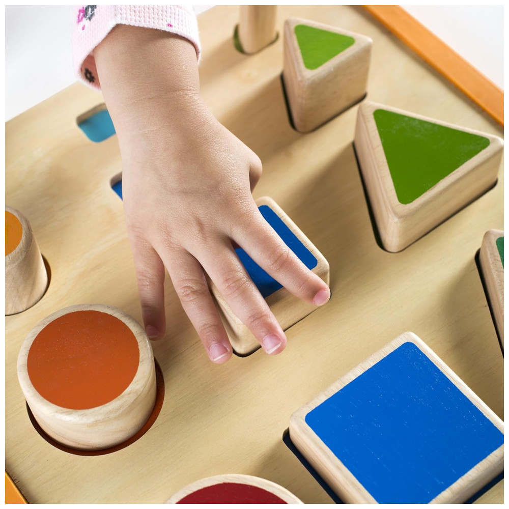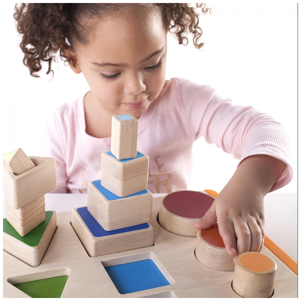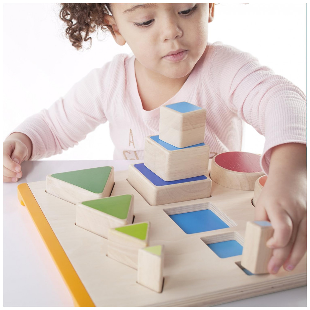 O Guidecraft Nest and Stack Shapes é um brinquedo educativo de encaixe e empilhamento desenvolvido para crianças a partir de 2 anos, com foco em coordenação motora fina, destreza e raciocínio espacial. O tabuleiro em madeira possui cavidades autoexplicativas nas quais as crianças podem encaixar, empilhar ou agrupar blocos coloridos em diferentes formatos geométricos.