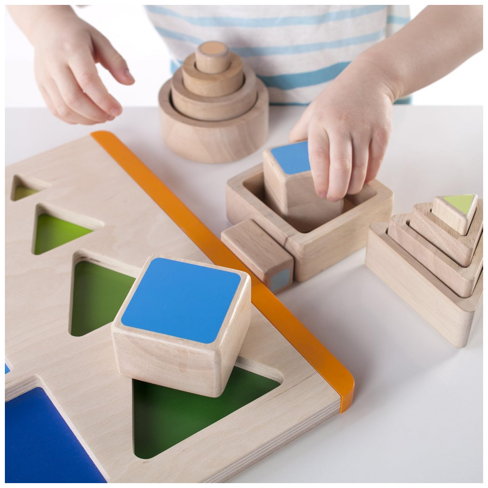 As peças são produzidas em madeira maciça de seringueira (rubberwood), com acabamento serigrafado e superfícies lisas, enquanto a base é feita em compensado de bétula com alças em plástico macio reforçado para facilitar o transporte. O conjunto permite atividades de classificação por cor e forma, empilhamento de blocos e encaixe tipo “nesting”, apoiando o desenvolvimento de noções matemáticas iniciais e habilidades de resolução de problemas.