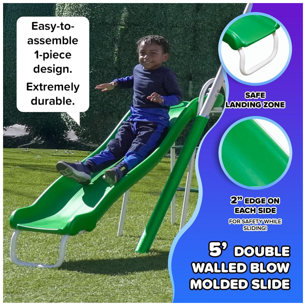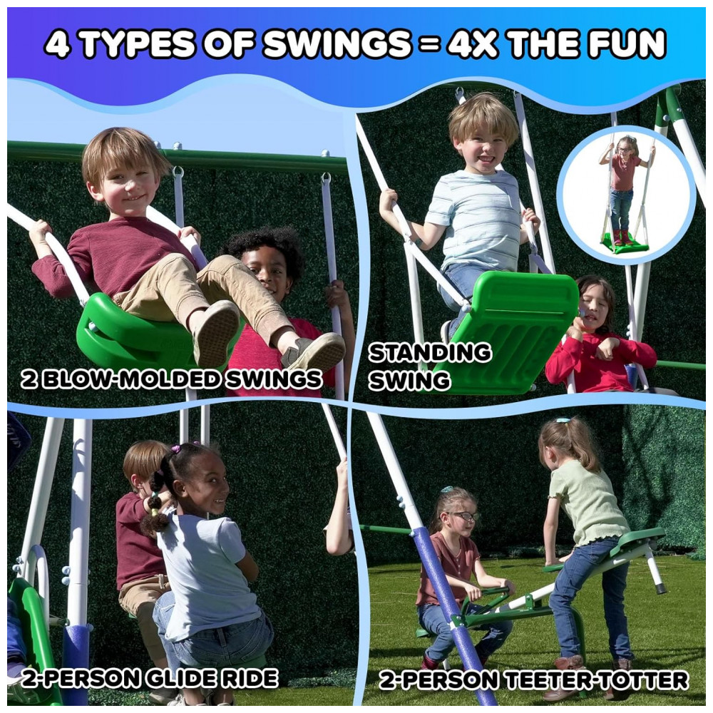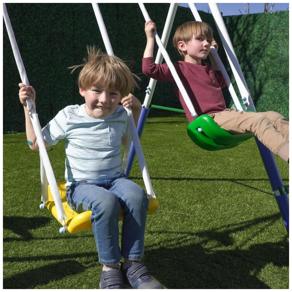 O conjunto de balanço metálico Sportspower Park Ridge é fabricado em aço com pintura eletrostática na cor verde e detalhes em branco, proporcionando alta resistência à corrosão e durabilidade para uso externo. Possui capacidade para até 8 crianças simultaneamente, suportando peso máximo total de 363 kg, com limite individual de 45 kg por usuário. O conjunto inclui dois balanços moldados, um balanço moldado em pé, um balancim romano para duas pessoas, gangorra (teeter totter) e escorregador ondulado de 1,52 metros.As correntes dos balanços são revestidas em PVC para maior conforto e segurança na manipulação, evitando pinçamentos. As pernas do quadro possuem espuma acolchoada para proteção adicional. O kit de quatro peças para âncoras facilita a fixação segura do conjunto no solo. Recomendado para crianças de 3 a 8 anos e atende às normas ASTM e CPSIA de segurança. Montagem requerida.