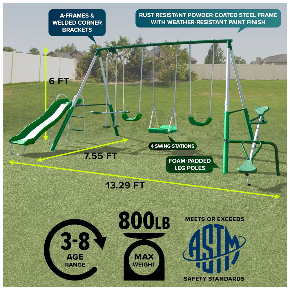 Set de Balanço Metálico Sportspower Park Ridge Verde/Branco com 2 Balanços Balanço em Pé Balancim Romano 2 Pessoas Gangorra Escorregador 152 m Kit de Âncoras Capacidade 363 kg